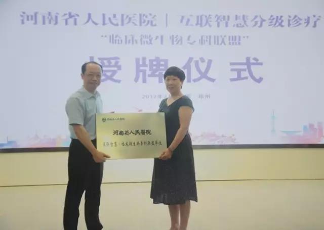 7月7日-9日,河南省人民醫院互聯智慧“臨床微生物專科聯盟”啟動會在鄭州舉行,檢驗科微生物室作為全省首批100多家聯盟單位前往參加該儀式。省人民醫院院領導、公共事業發展部主任梁新亮、互聯智慧分級診療醫學中心主任成巧梅、省人民醫院檢驗科主任孫長義、主任李軼等進行授牌。周口市中醫院檢驗科劉美華主任接受授牌。
