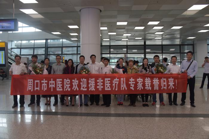 2017年9月14日,由周口市衛生計生委選派的中國第19批援埃塞俄比亞、厄立特里亞醫療隊圓滿完成援外醫療任務,平安回國。周口市中醫院副院長史衛東、醫教科科長胡維來、人事科科長宋君、手術室主任楊樹山、腦二病區副主任王俊峰及援非隊員親屬親臨新鄭國際機場迎接援非專家凱旋歸來。