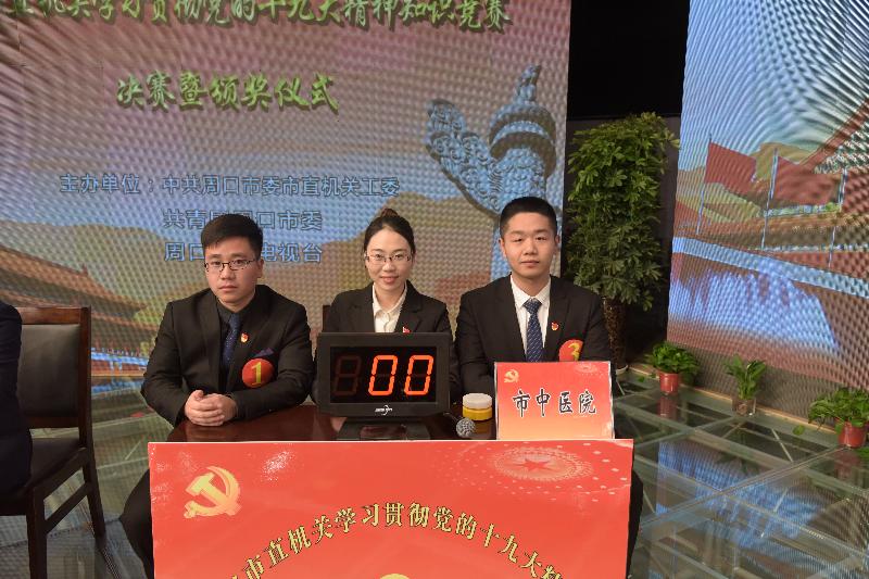 周口市中醫院代表隊由黨辦主任于建玲擔任領隊,參賽選手由梁玉華,史明,杜瑞豪和候補隊員趙文博組成,在初賽中,以小組第一的優異成績進入復賽,在第二輪復賽中,經過激烈的角逐,在前期劣勢的情況下,比賽后半段連連得分,成功反超比分,以復賽小組第一的成績挺進決賽!最終,在決賽中,獲得三等獎的優異成績。因我院開展形勢多樣的學習十九大活動,有網上答題和組織支部知識競賽等掀起學習十九大精神的高潮,另獲得“組織獎”的榮譽。(宣傳科)