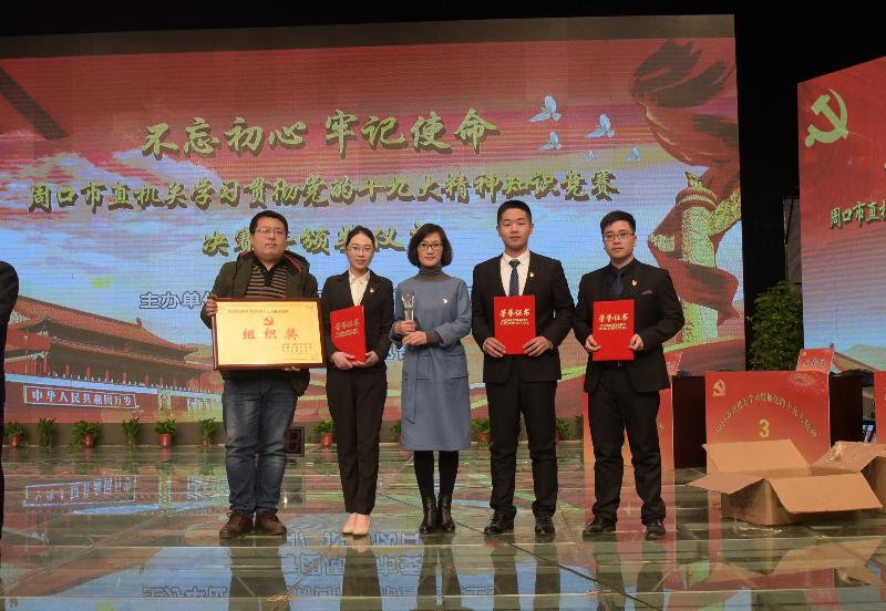1月12號下午,市直機關學習貫徹黨的十九大精神知識競賽決賽暨頒獎儀式在周口廣播電視臺多功能演播廳舉行。省委省直工委專職委員孫華斌,市委常委、市委秘書長李云,市政協副主席、黨組副書記楊珺,市人大常委會黨組成員、市總工會主席游保峰出席。