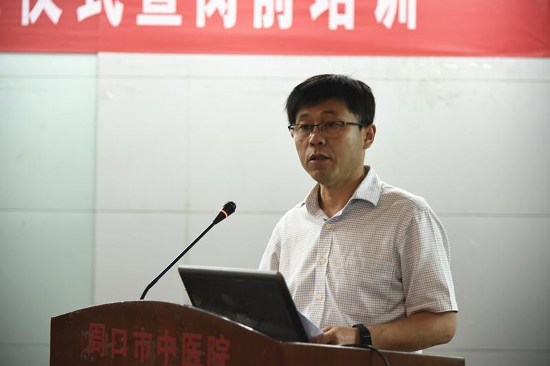 2018年9月14日上午,市中醫(yī)院在行政樓六樓會議室開展2018中醫(yī)住院醫(yī)師規(guī)范化培訓(xùn)開班儀式,開班儀式由周口市中醫(yī)院副院長史衛(wèi)東、醫(yī)教科科長胡維來、醫(yī)教科相關(guān)科室人員及33名學(xué)生參加。儀式由醫(yī)教科科長胡維來主持。