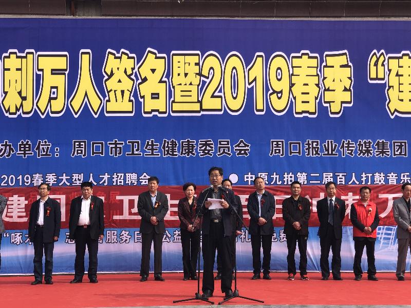 2019年4月19日上午,由市衛(wèi)健委和報(bào)業(yè)傳媒集團(tuán)聯(lián)合舉辦的“周口創(chuàng)建國家衛(wèi)生城百日沖刺萬人簽名會開幕式”在五一文化廣場隆重舉行。市衛(wèi)健委主任金玉貞出席了本次活動,副主任劉劍鋒作出講話。