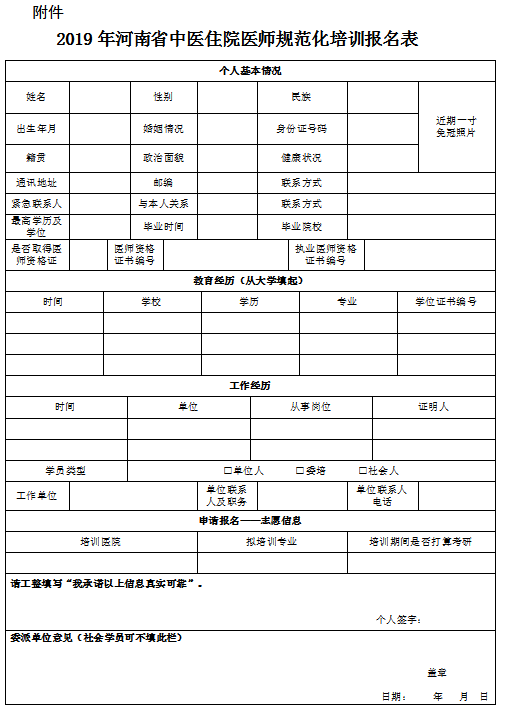 點擊下載:《2019年河南省中醫住院醫師規范化培訓報名表》