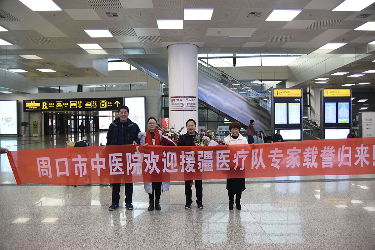 2019年12月19日,由周口市衛健委選派的第十一批援疆醫療隊圓滿完成援疆醫療任務,載譽而歸。周口市中醫院援疆醫療專家副主任醫師邢儀霞、副主任醫師薛宗哲受到院方代表及援疆隊員親屬親臨新鄭國際機場熱烈迎接和鮮花。