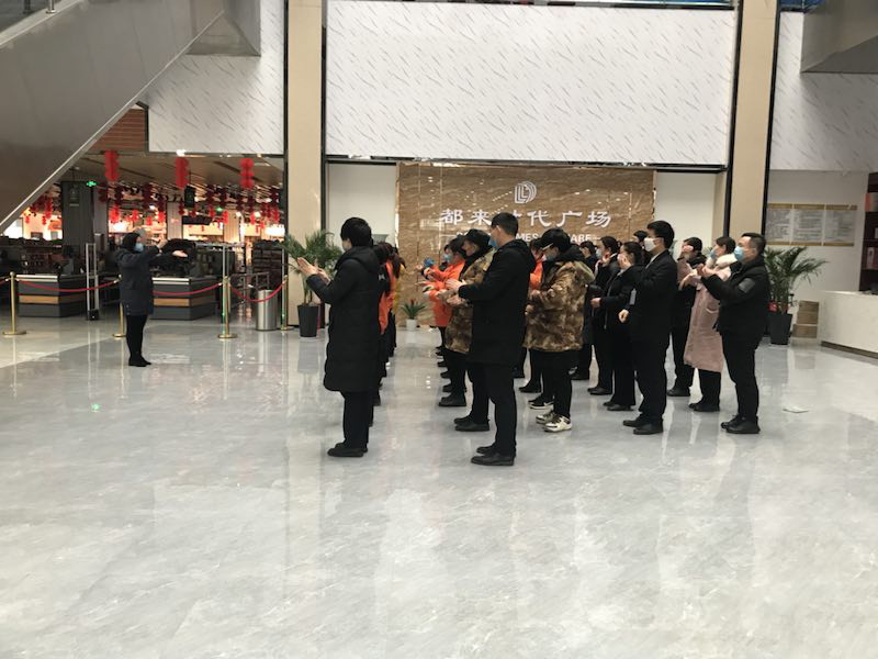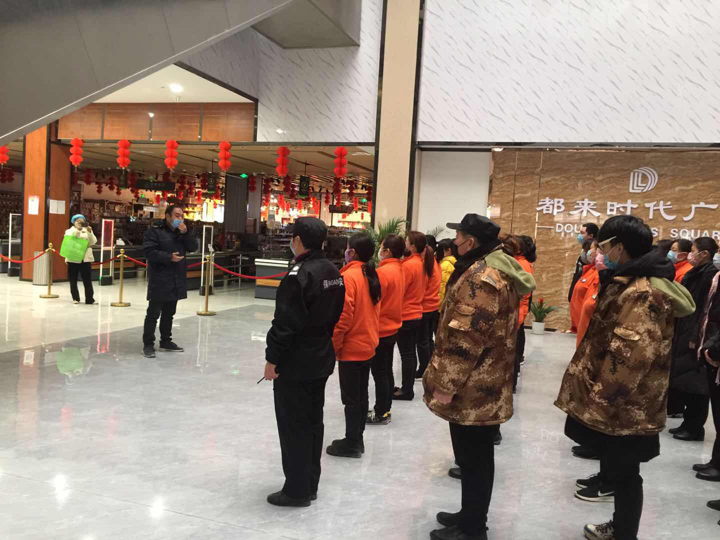2020年2月29日上午8點,蘇博文、周春燕、張靜茹來到都來時代廣場,對都來時代廣場全體員工進行了防控指導工作。