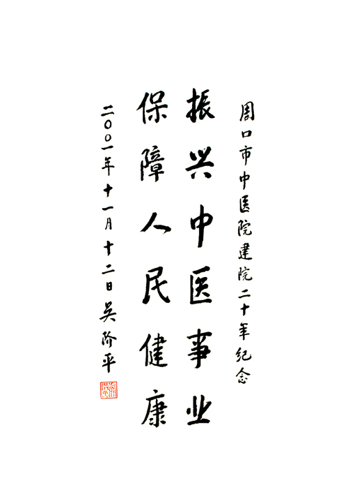 原全國人大副委員長吳階平在周口市中醫院建院二十周年慶典時題詞