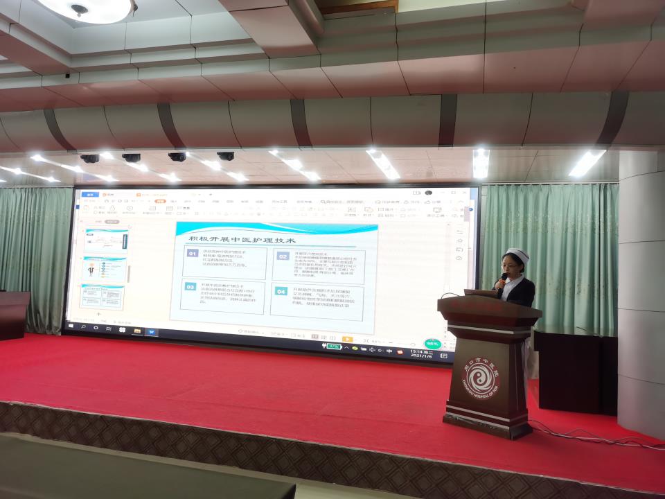 28個護理單元的護士長以PPT的形式對科室一年來的護理工作進行了簡要的總結,利用數據和護理質量敏感指標等護理管理工具,從護理工作完成情況、疫情防控、中醫特色、專科特色、質量管理、教學科研、人才培養、新技術、新業務等多個方面向大家展示過去一年所取得的成果,梳理了各科室未來工作中的重點和難點,在此基礎上提出科室2021年護理工作新思路,新目標。