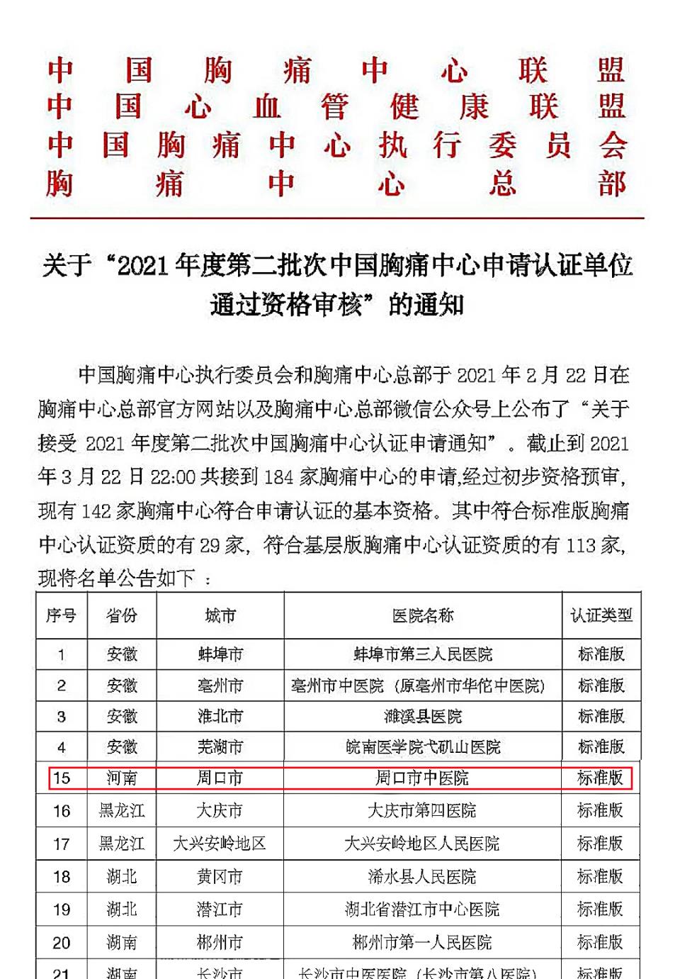 中國胸痛中心執(zhí)行委員會(huì)和胸痛中心總部最近在胸痛中心總部官方網(wǎng)站以及胸痛中心總部微信公眾號(hào)上公布了“關(guān)于接受2021年度第二批次中國胸痛中心認(rèn)證申請(qǐng)通知”,截止到2021年3月22日22:00共接到184家胸痛中心的申請(qǐng),經(jīng)過初步資格預(yù)審,現(xiàn)有142家胸痛中心符合申請(qǐng)認(rèn)證的基本資格。其中符合標(biāo)準(zhǔn)版胸痛中心認(rèn)證資質(zhì)的有29家,周口市中醫(yī)院名列其中。