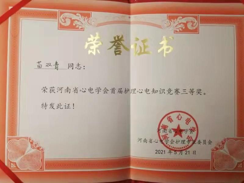 喜訊!我院苗雙青榮獲"河南省心電學會首屆護理心電知識競賽"三等獎