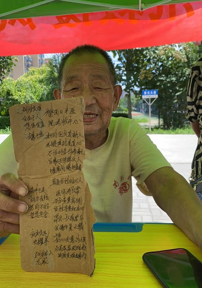史耀亭老人因?yàn)榛加懈哐獕海刻於既ゾ戎c(diǎn)測(cè)量血壓,醫(yī)務(wù)人員為其測(cè)量血壓,指導(dǎo)用藥,科普健康生活方式。7月24日上午,史耀亭老人又來到了救助點(diǎn),量完血壓,沒有急著回去,而是站在對(duì)面樹蔭下觀察醫(yī)務(wù)人員,看到他們實(shí)在辛苦,有感而發(fā),就地取材,把感謝信寫在了廢紙片上。戰(zhàn)勝災(zāi)難全在人,想保健康全靠于您。