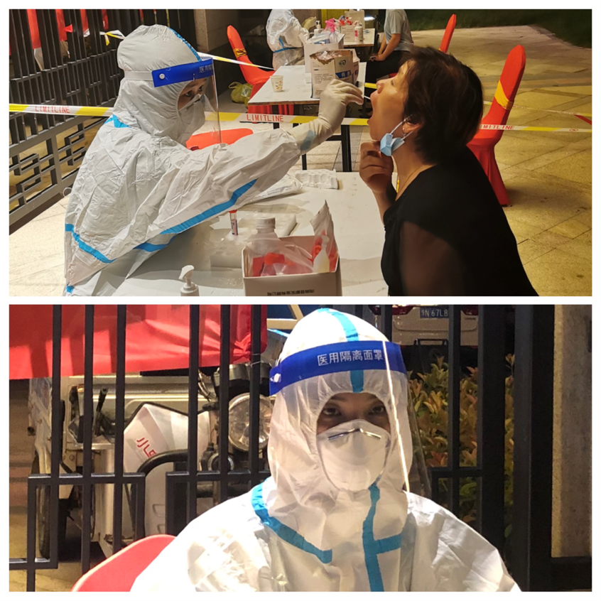 為了確保核酸采集工作順利進行,院黨委委員、工會主席孫俊帶領我院支援醫療隊在商丘市睢陽區政府的密切協同下,不停歇的奔波于2個核酸采集點,根據核酸采集點的實際情況隨時調配物資,一路上電話不停,及時研判,對接各核酸采集點的負責人,溝通協調處理各項事宜。采集小組的組長尚萌、張麗輝、盧平三位護士長各司其職,分工協作,有條不紊組織人員有序開展工作。這支30名核酸醫療隊,她們穿著密不透風的防護服,操作規范,聽從指揮;她們頂著‘秋老虎’的悶熱高溫,連夜奮戰;她們為了減少群眾等待的時間,盡量避免喝水,以減少上廁所的頻次,耽誤寶貴的時間;她們在緊張地更換防護服的間隙分享采樣心得,鼓勵加油!