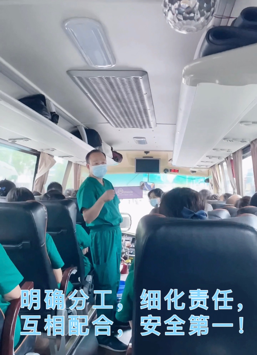 在援商丘大巴車上,孫主席與當地衛健委工作人員溝通后再次對工作進行安排。將出征隊分為五組,統一聽從指揮,互相配合,安全第一。