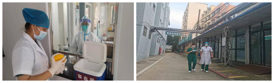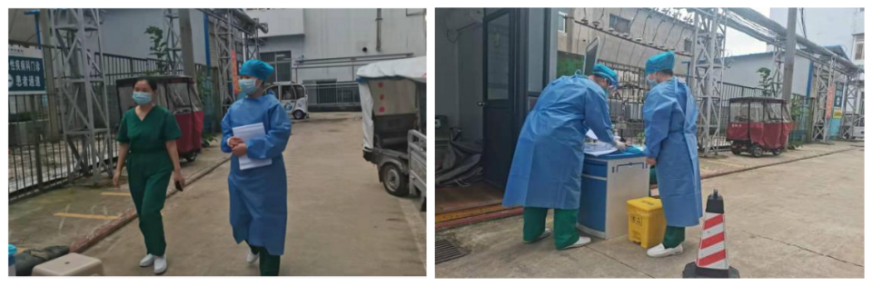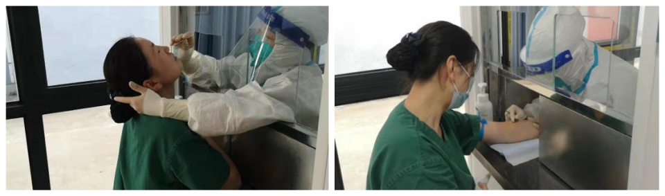 發熱門診護士引導患者到采樣窗口采集新型冠狀病毒核酸及血常規標本,并帶領患者到CT室檢查。