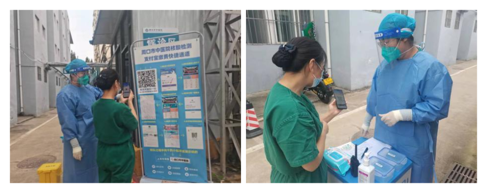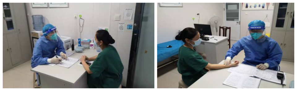 發熱門診分診處護士指導患者掃行程碼、出示健康碼,兩碼均為綠碼,用水銀體溫計再次測量患者體溫,詢問其近14天來的行動軌跡和接觸史,做好記錄,協助患者辦理虛擬就診卡。