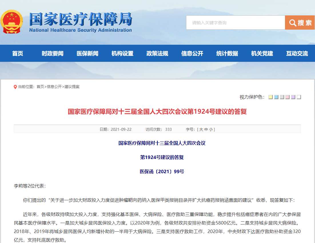 用上好藥、用得起好藥一直是所有癌癥患者的期盼。近年來,通過國家醫(yī)保談判等方式,被稱為“救命藥”的抗腫瘤藥物大幅降價(jià),患者可及性不斷提升。那么,醫(yī)保對(duì)于抗癌藥物及治療方面有何最新政策?對(duì)此,國家醫(yī)保局在9月回復(fù)兩會(huì)代表委員的建議、提案中進(jìn)行了相關(guān)內(nèi)容的答復(fù)。