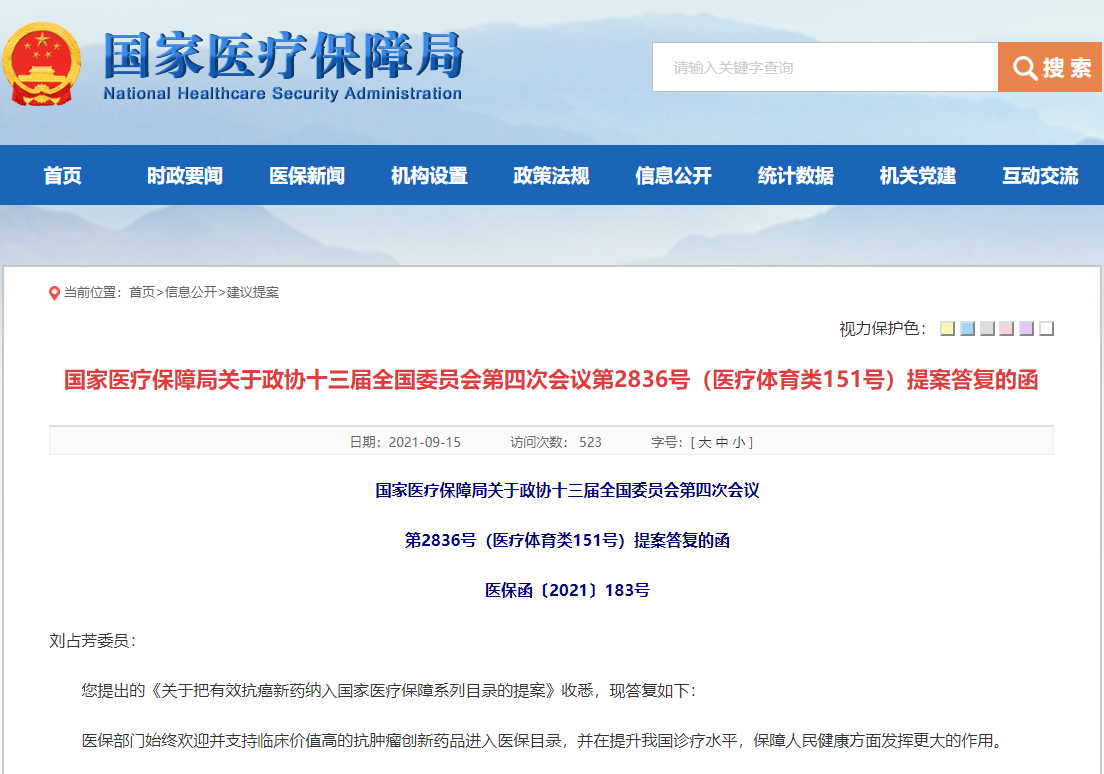 國家醫(yī)保局在對(duì)政協(xié)十三屆全國委員會(huì)第四次會(huì)議第2836號(hào)提案的答復(fù)中介紹,自國家醫(yī)保局成立以來,建立醫(yī)保藥品目錄動(dòng)態(tài)調(diào)整機(jī)制,從最長(zhǎng)8年調(diào)整1次縮短至每年動(dòng)態(tài)調(diào)整,目錄調(diào)整周期大幅縮短,很多創(chuàng)新藥批準(zhǔn)上市當(dāng)年就可以申請(qǐng)進(jìn)入目錄。