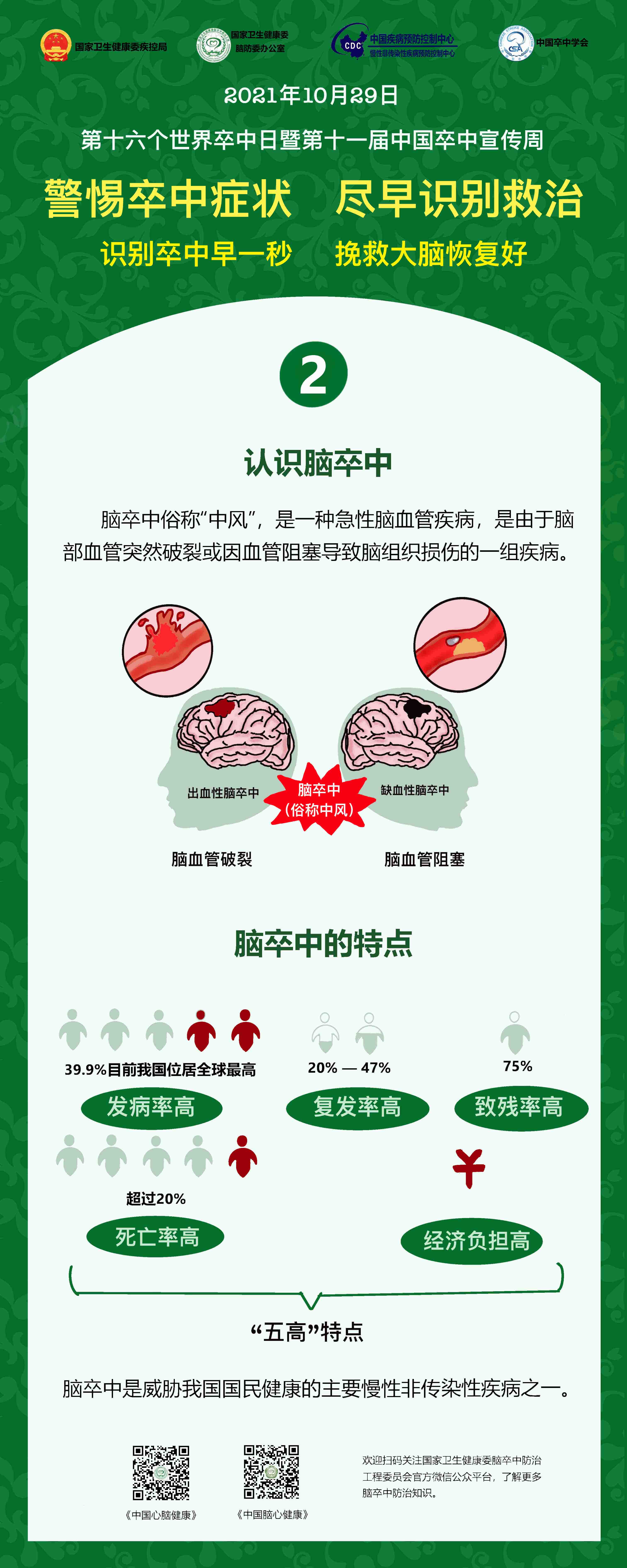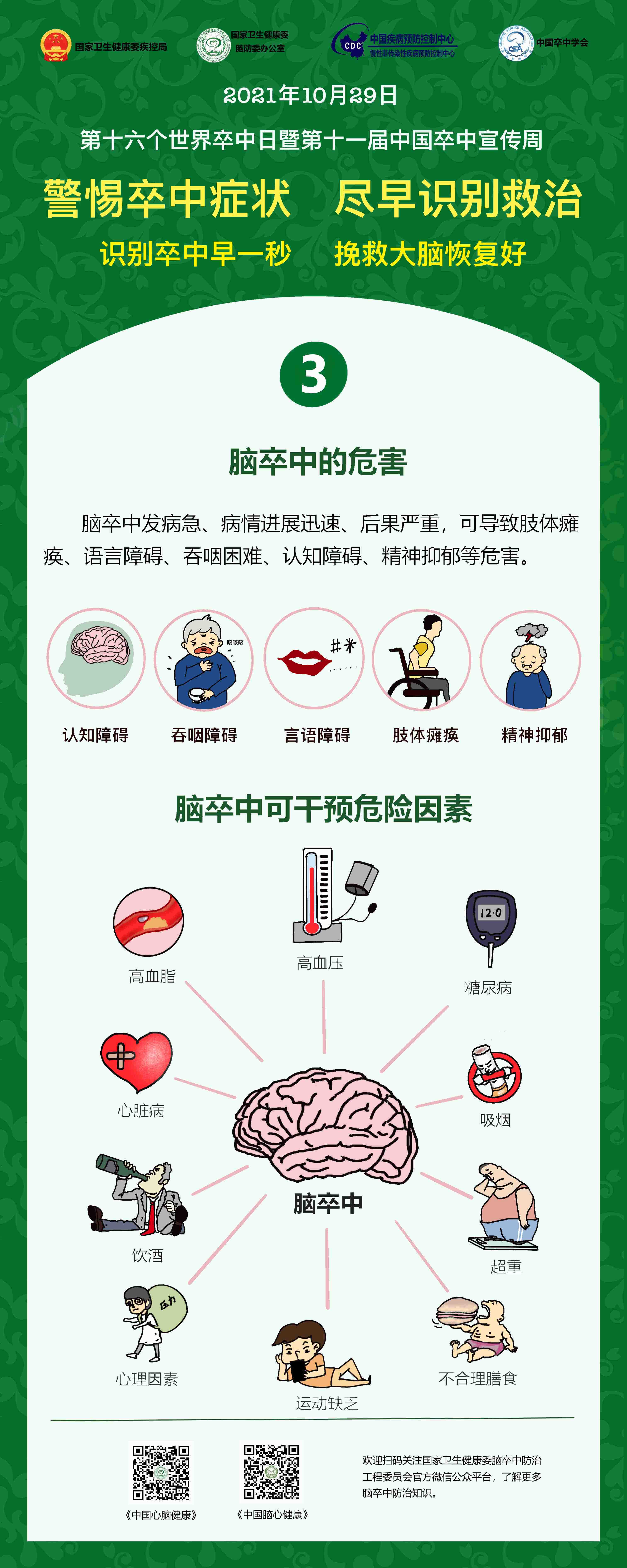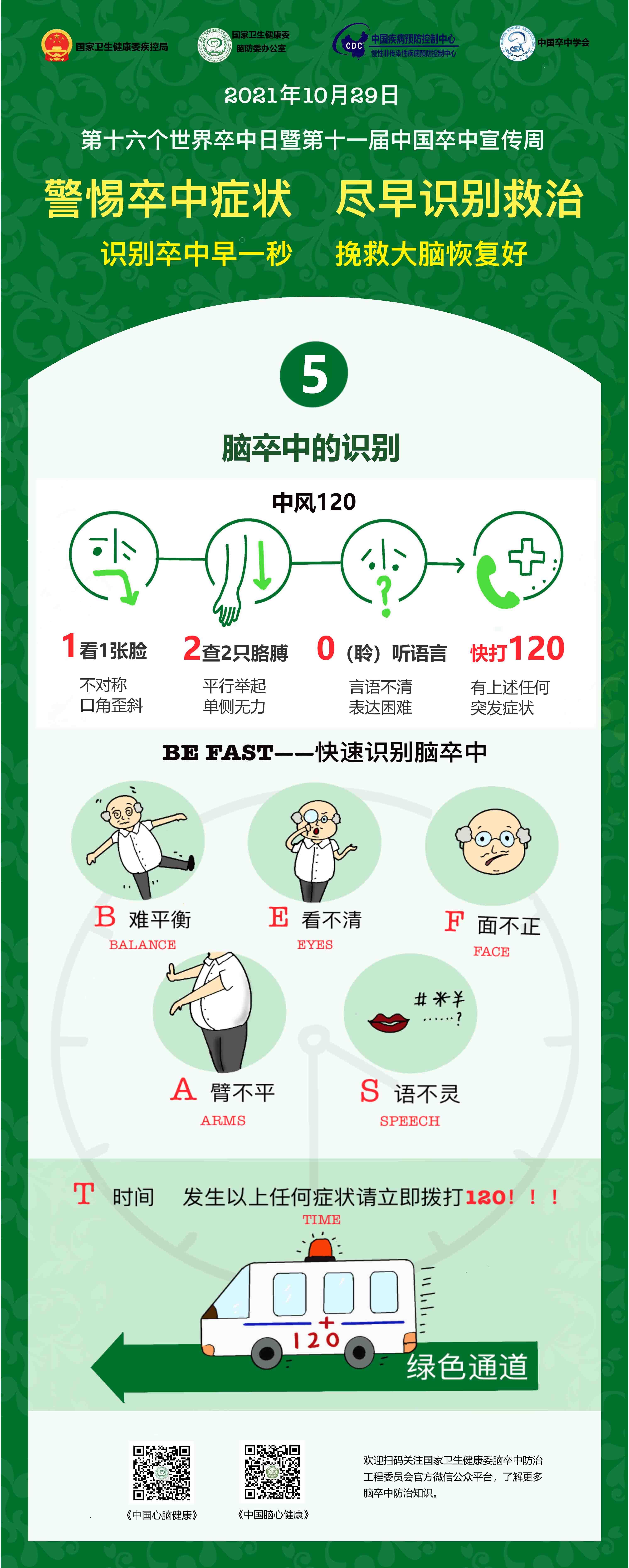 腦卒中是我國居民致死、致殘的第一大原因,有效防控腦卒中對實現健康中國及減少我國貧困人群的戰略目標意義重大。為貫徹落實相關文件精神,有效預防和控制腦卒中高危因素,提高群眾卒中識別能力,減少因卒中導致的死亡、殘疾人群,國家衛生健康委腦卒中防治工程委員會辦公室決定組織開展2021年“世界卒中日”暨第11屆全國卒中宣傳周相關活動。今年的宣傳主題是"警惕卒中癥狀,盡早識別救治”,宣傳口號是“識別卒中早一秒,挽救大腦恢復好”。