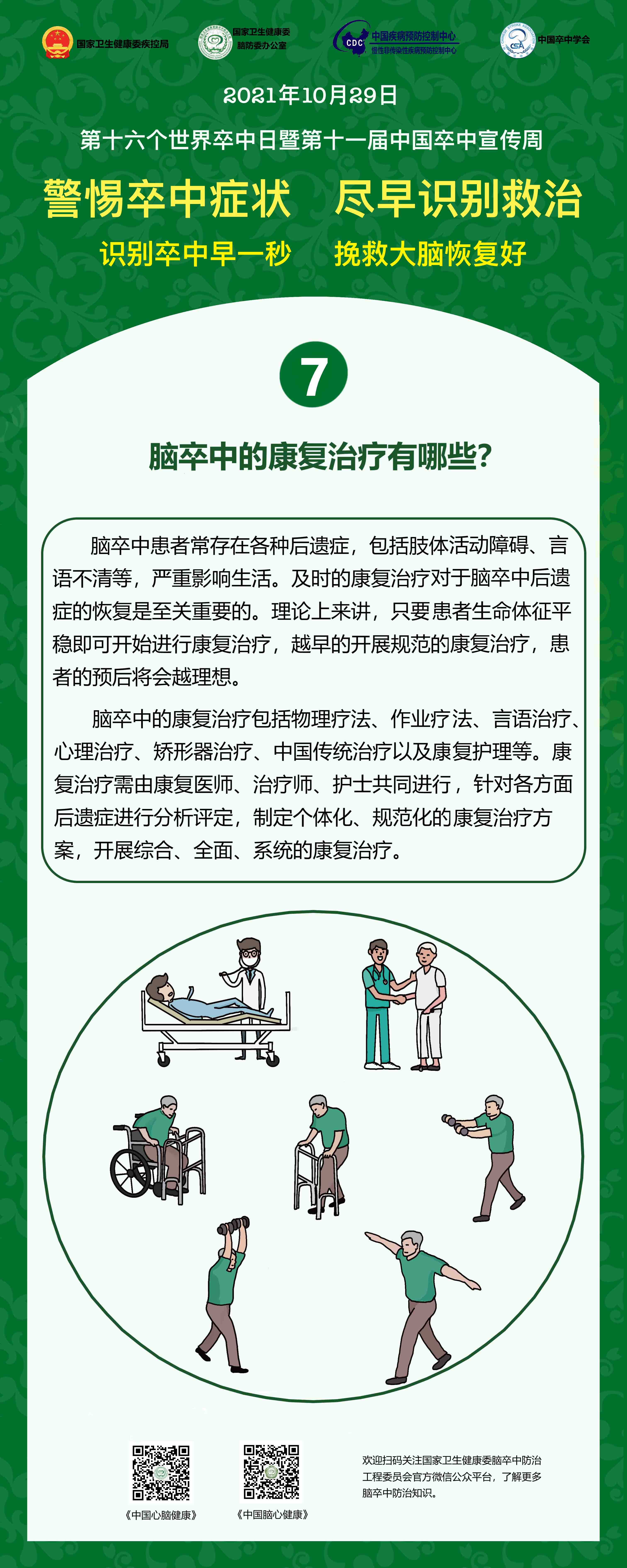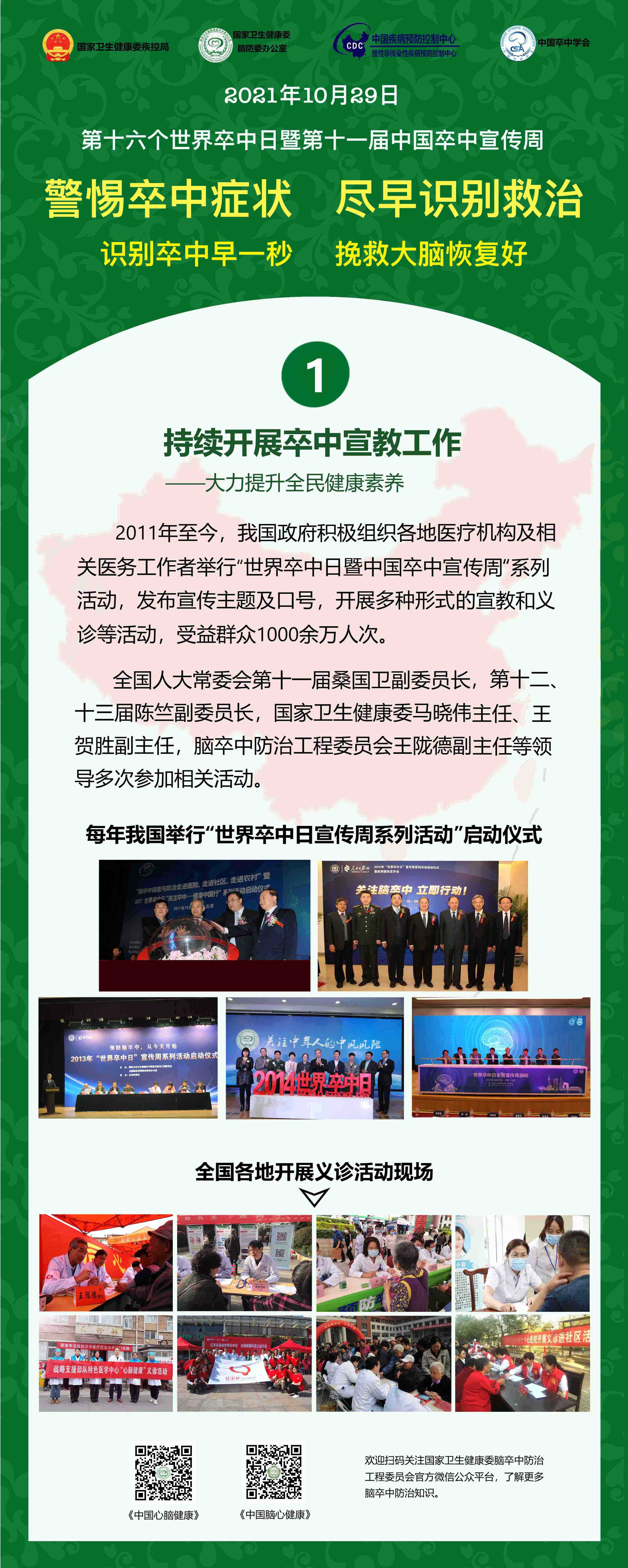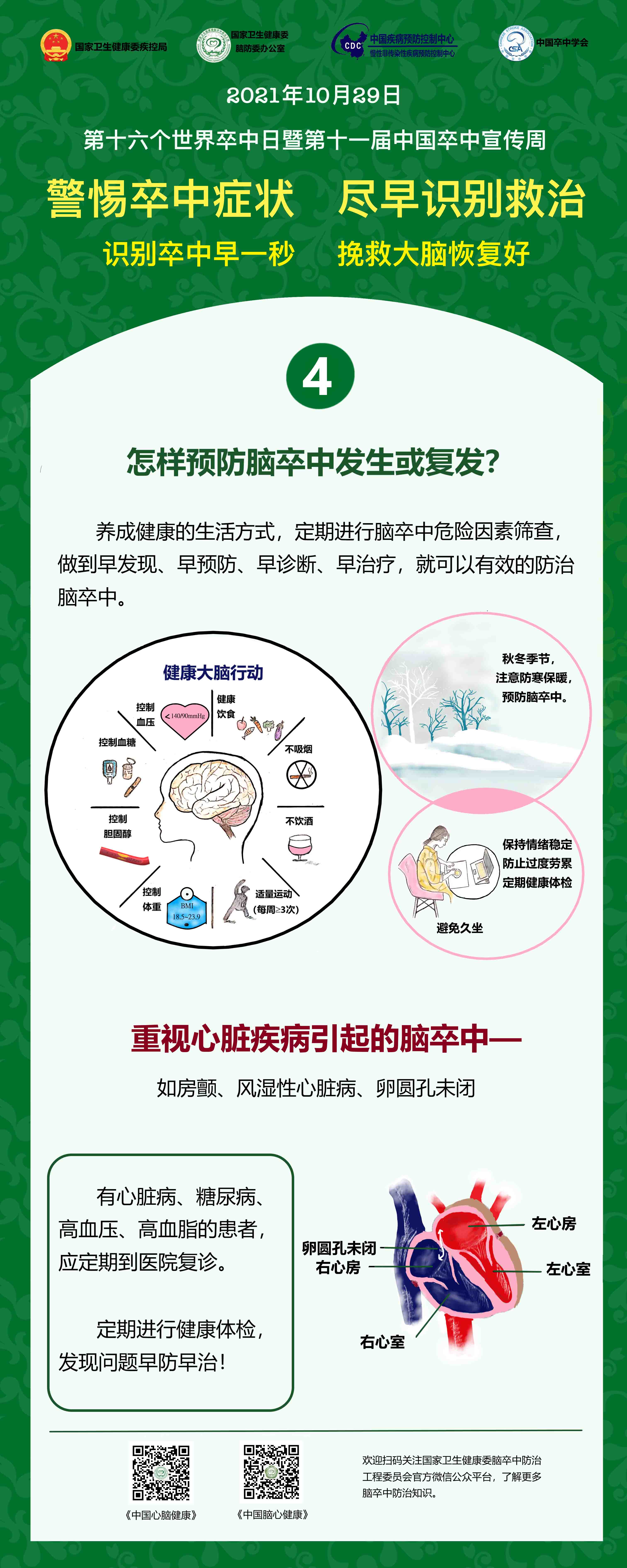 腦卒中是我國居民致死、致殘的第一大原因,有效防控腦卒中對實現健康中國及減少我國貧困人群的戰略目標意義重大。為貫徹落實相關文件精神,有效預防和控制腦卒中高危因素,提高群眾卒中識別能力,減少因卒中導致的死亡、殘疾人群,國家衛生健康委腦卒中防治工程委員會辦公室決定組織開展2021年“世界卒中日”暨第11屆全國卒中宣傳周相關活動。今年的宣傳主題是"警惕卒中癥狀,盡早識別救治”,宣傳口號是“識別卒中早一秒,挽救大腦恢復好”。