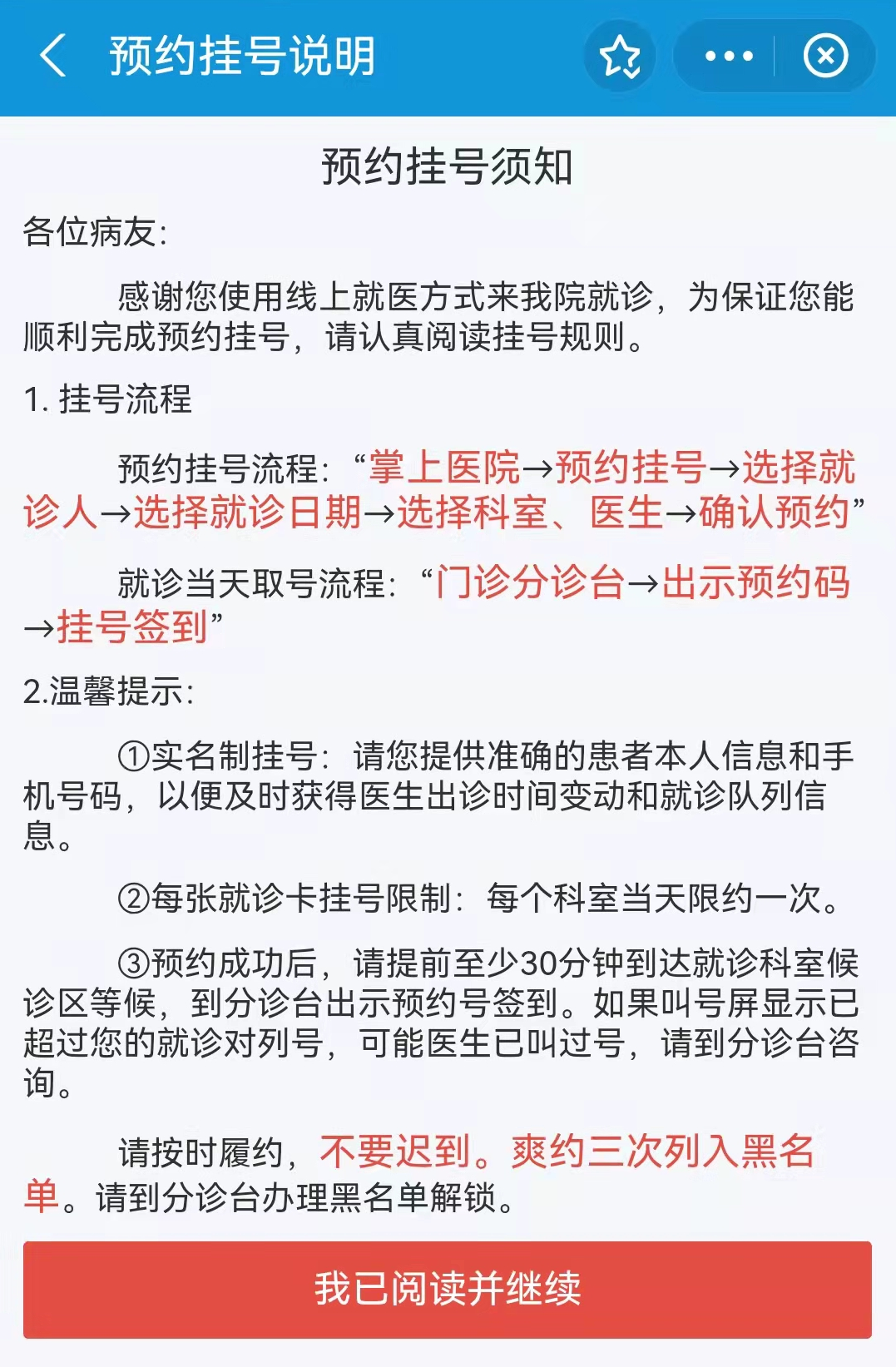 請認真閱讀預約掛號說明。閱讀完畢后點擊“我已閱讀并繼續”。