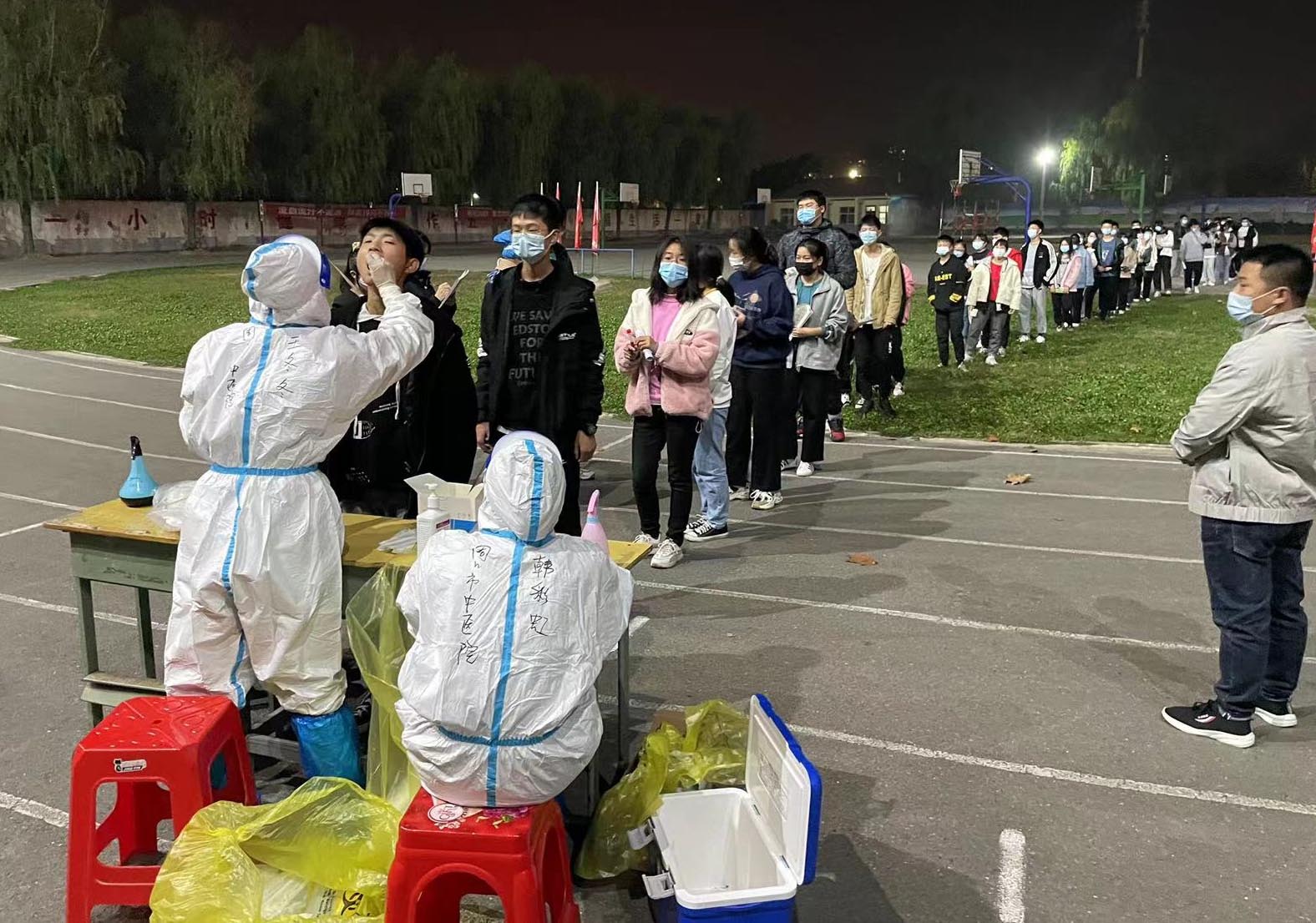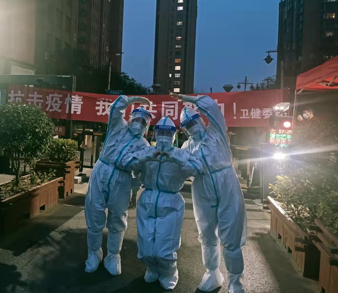 11月4日6時,周口市中醫院醫療隊到達扶溝縣衛健委,帶隊隊長何雪花主任、副隊長王輝主任和王真真護士長與當地工作人員認真對接,接到當日需在10個采集點,采集1.5萬人次的指示。我們剛到采集點時看到排著長隊的群眾,不容我們多想,我們立馬換上防護服投入戰斗。由于小區老年人跟小孩子比較多,剛開始進度很慢,在張贊老師的帶領下很快找到了方法,大家配合的也越來越默契,兩千多人的核酸下午五點我們就超額完成了任務,中間沒有休息,沒有替換人,大家沒有一個人喊累。
