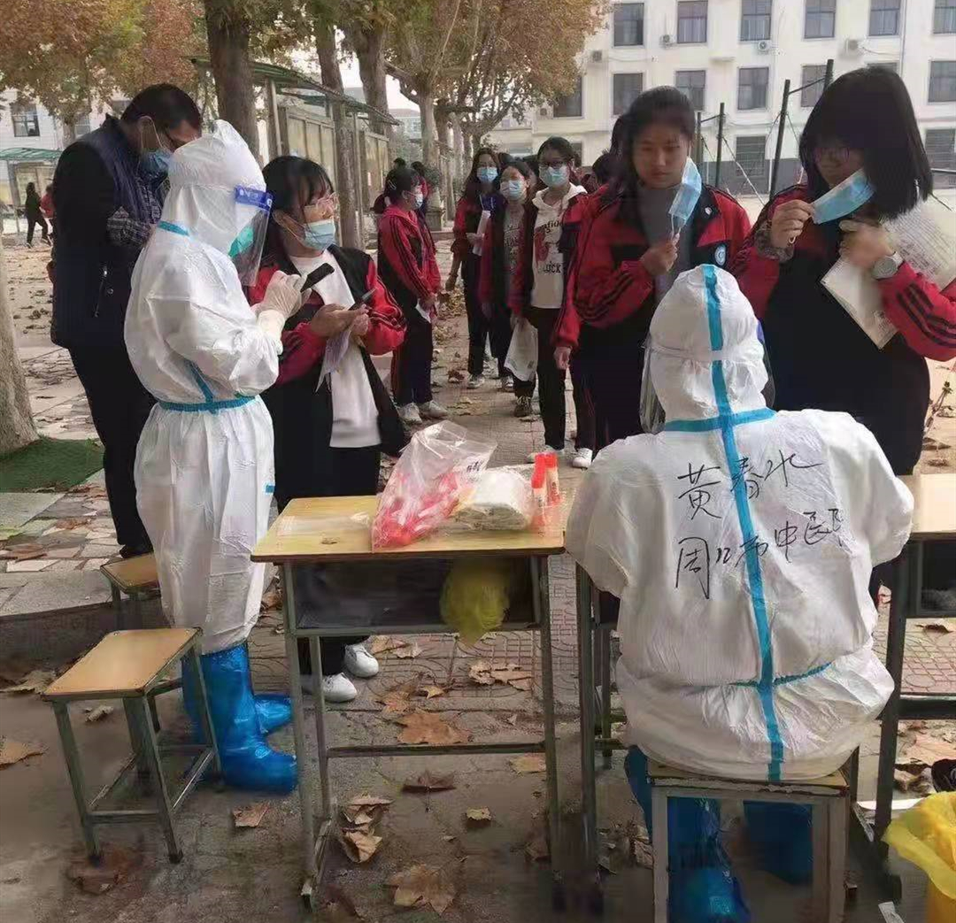 早上6點(diǎn)到達(dá)扶溝縣衛(wèi)健委,我們醫(yī)院分配到10個(gè)核酸采集點(diǎn),3人一組,2人一隊(duì),一個(gè)機(jī)動(dòng)人員!我和社區(qū)的蘇四霞、腦外的許丹丹一組,我們?nèi)吮环峙涞饺藬?shù)最多的南園高中。但是我們并沒有任何質(zhì)疑,而是異口同聲地說,放心,我們雖然人多,但是我們也會(huì)盡全力完成任務(wù)!隨后,我們就開始各自分配任務(wù),誰來采集,誰來機(jī)動(dòng),并決定今天不管多晚,加班咱也得干完!剛到了學(xué)校后,我們與校內(nèi)的老師協(xié)調(diào)分配好,就開始了緊張有序地工作。到了下午2點(diǎn)40左右,我們?cè)缫淹损囸I,其中一個(gè)老師提醒我們說,你們先吃飯吧,歇一會(huì)兒!我們只想著再等一會(huì)兒吧,我們還不餓呢!時(shí)間緊,任務(wù)重。我們今天得一定得完成工作!在校內(nèi)老師的配合下我們?nèi)艘幌挛绮杉?500人左右!到了下午六點(diǎn)又增援了12名檢測(cè)員,在一個(gè)小時(shí)的時(shí)間內(nèi)圓滿完成任務(wù)。
