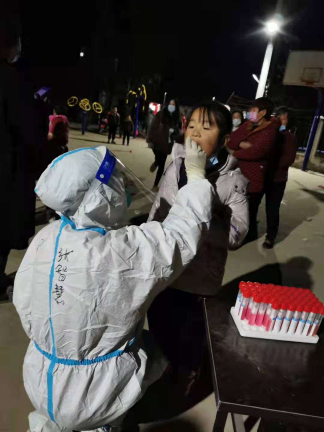 據了解,我院5名隊員被分派到扶溝縣江村鎮人口較多的一個村莊——李田村進行核酸采樣。在當地政府組織配合下,工作隊抵達采樣點立即奔向各自崗位,有條不紊的開展核酸采樣工作。為了讓居民盡快接受核酸檢測采樣,隊員們不敢多喝水、減少去廁所次數,爭分奪秒地采集核酸。隊員們穿著防護服,戴著防護面罩、手套,被裹得嚴嚴實實、密不透風,汗水濕透衣衫,從中午的桑拿悶熱到夜晚的冰涼刺骨,沒有一個人退縮。克服重重困難,協調各種關系,做到應檢盡檢,準確無誤。組織排隊,個人信息登記,掃碼上傳,采樣,包裝,消毒,統計,封裝,集中標本。直到夜里10點多,我院工作隊圓滿完成核酸采集工作。
