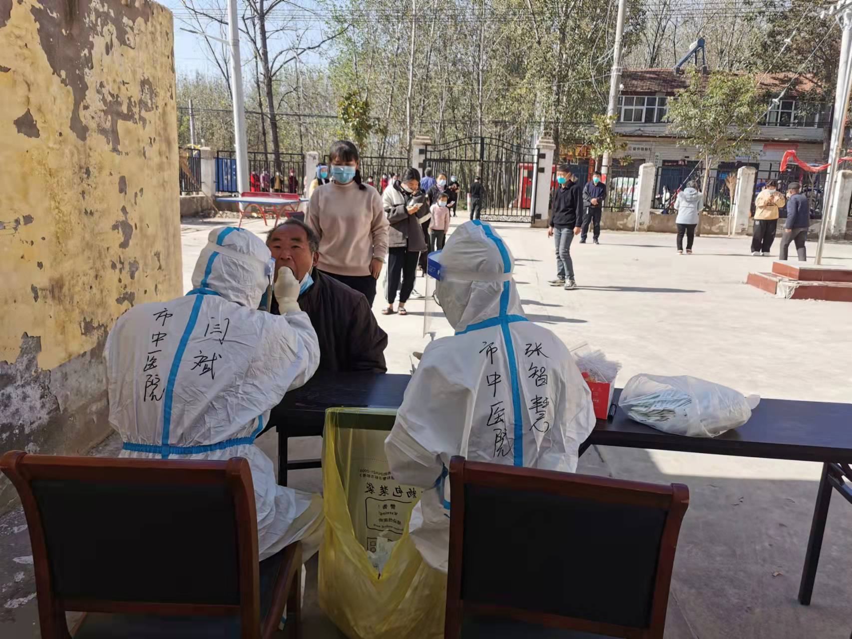 我院5名隊員還是被分派到江村鎮(zhèn)李田村。有了第一輪檢測經(jīng)歷,當?shù)卣M織得更加周全了,隊員們也干得更加熟練了,老鄉(xiāng)們配合得也更好了。當?shù)卣M織的志愿者維持秩序,分好組,排好隊,掃碼錄信息。隊員們在安全防護的前提下細致耐心地逐一采樣。一百個,兩百個,五百個,一千個……進展順利。為了不讓老鄉(xiāng)們長時間等待,隊員們一致同意一下干完,中間不休息。不吃不喝不休息不上廁所,下午四點終于圓滿完成任務,送走最后一個老鄉(xiāng)。此時,當?shù)卣蛠淼闹形顼堅缍紱鐾噶恕5覀兊年爢T們仍然嚴格按照操作規(guī)范收拾物品,整理封裝標本,上傳條碼信息,最后打掃衛(wèi)生,消毒。老鄉(xiāng)們一個個豎起大拇指,稱贊:周口市中醫(yī)院真中!