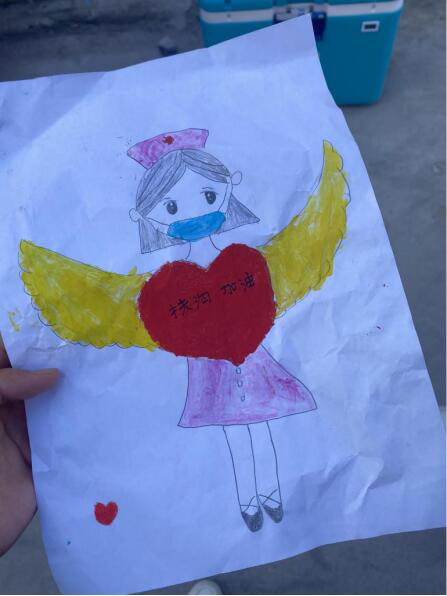 由于入戶檢查的原因,我們必須四點起床開始一天的繁忙而又嚴肅的工作。在大家結束一天的工作任務后,一個小女孩在她媽媽的鼓勵下略顯不好意思地跑來送給我們了一幅她畫了三天的畫,給我們鞠了一躬,奶聲奶氣地說“謝謝天使姐姐”后,飛一般的跑開。我們展開一看,發現小朋友把我們畫成天使。這時,一天的疲憊都一掃而光,我們心中充滿了自豪和驕傲,畢竟做“守護者”就是擔使命、保安康!