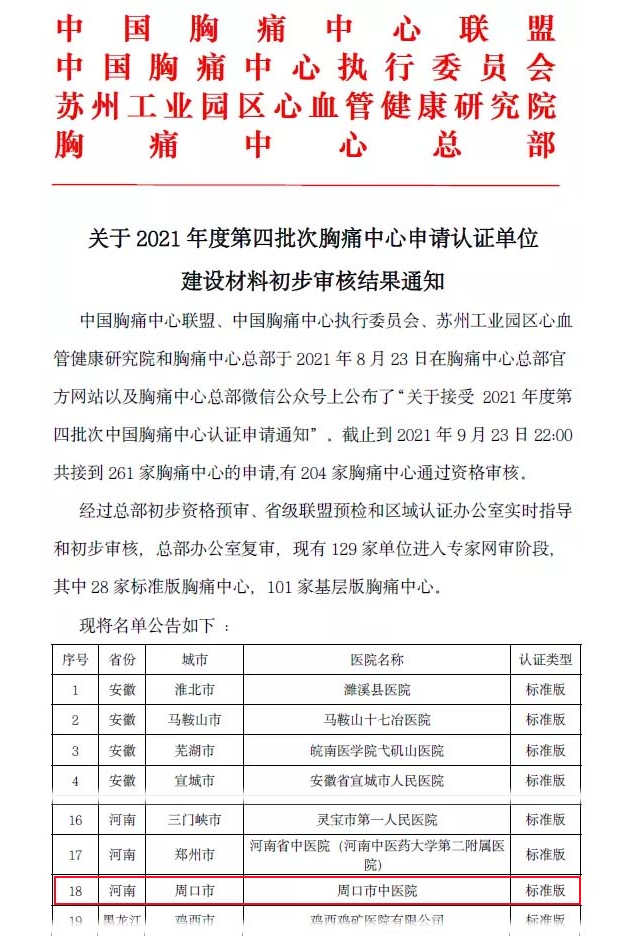 胸痛中心建設經過持續完善,目前已經通過總部初步資格預審、省級聯盟預檢、區域認證辦公室實時指導和初步審核、總部辦公室復審的環節,在2021年度第四批次胸痛中心申請認證中,中國胸痛中心聯盟、中國胸痛中心執行委員會、蘇州工業園區心血管健康研究院和胸痛中心總部公布了129家單位進入專家網審階段,其中28家標準版胸痛中心,我院胸痛中心名列其中。