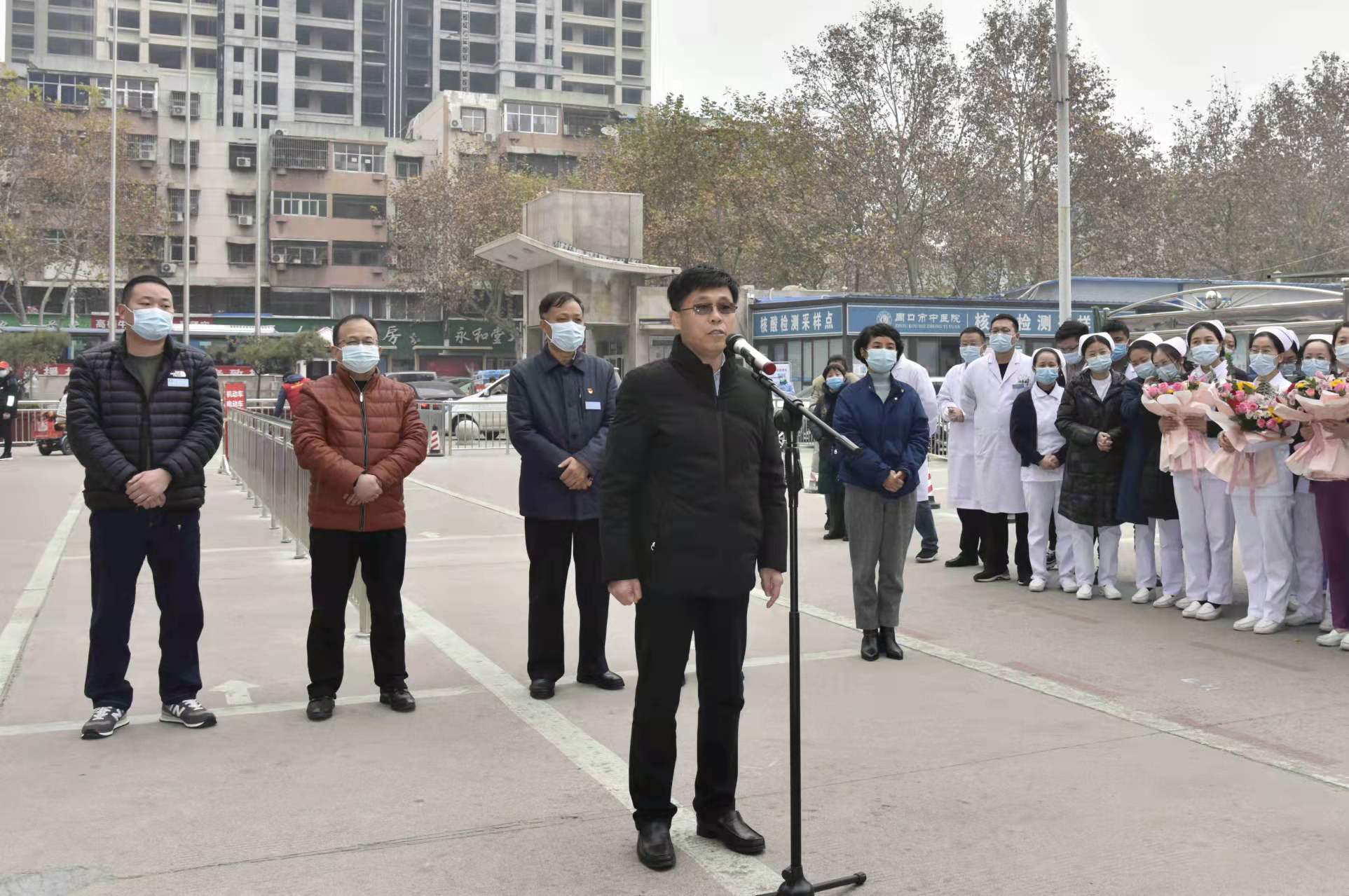 12月10日,周口市中醫(yī)院支援扶溝醫(yī)療隊(duì)31名白衣戰(zhàn)士在扶溝奮戰(zhàn)37天圓滿(mǎn)完成任務(wù)解除隔離,平安歸來(lái)。周口市中醫(yī)院在門(mén)診樓前為他們舉行歡迎儀式。市中醫(yī)院黨委書(shū)記劉廣明、副院長(zhǎng)史衛(wèi)東、各科室負(fù)責(zé)人以及醫(yī)療隊(duì)員家屬參加歡迎儀式。劉廣明書(shū)記主持歡迎儀式。