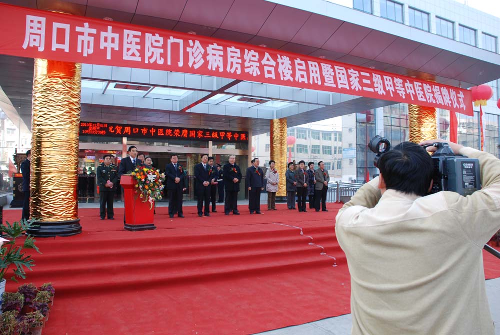2010年12月1日,周口市中醫院門診病房綜合樓啟用暨國家三級甲等中醫院揭牌儀式隆重舉行。河南省人大常委會黨組書記、常務副主任李柏栓、全國政協常委、農工黨河南省委主委、省人口與計劃生育委員會主任高體健、河南省衛生廳副廳長、河南省中醫管理局局長夏祖昌 、解放軍北京307醫院副政委魏建國、副政委李昆蘭、周口市委書記毛超峰、周口市政府市長徐光、周口市委副書記呂彩霞、周口市人大常委會主任李洪民、周口市政協主席穆仁先、周口市委秘書長李明方、市委宣傳部長梅寶菊、市委統戰部長武建新、市人大副主任張寧萍、市政協副主席李海龍、市政協副主席楊春、市總工會主席朱桂英等出席揭牌儀式,周口市衛生局局長解冰山以及各醫療機構的有關領導出席了慶典儀式,現場洋溢著一派熱烈的喜慶氣氛。