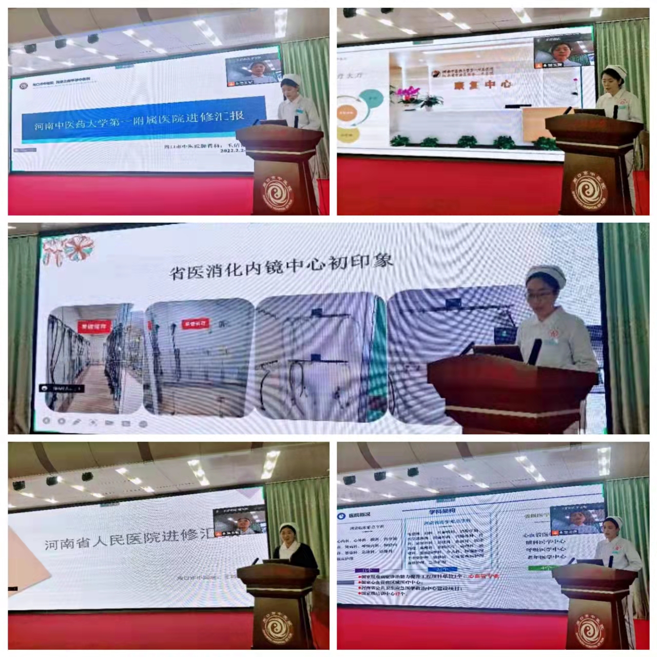 踏夢而行,攬月而歸。匯報會上,護士長申秋月、王飛飛、李丹、王婷婷、脾胃科護士毛倩倩5名護理人員從各自專業特點和學習方向,分別從進修學習的情況,專科護理發展、科學管理模式、人文護理、團隊建設、創新護理技術的應用以及中醫護理技術在臨床應用中發揮的獨特魅力和優勢等多角度、多細節地展示了學習成果和所見、所聞、所學、所感結合我院實際情況提出了工作思路和工作目標,并以圖文并茂的方式,通過PPT向大家呈現出來,達到了“一人學習,眾人受益,共同提升”的目的。會場掌聲不斷,大家紛紛表示受益匪淺。
