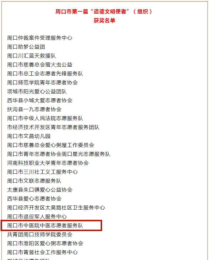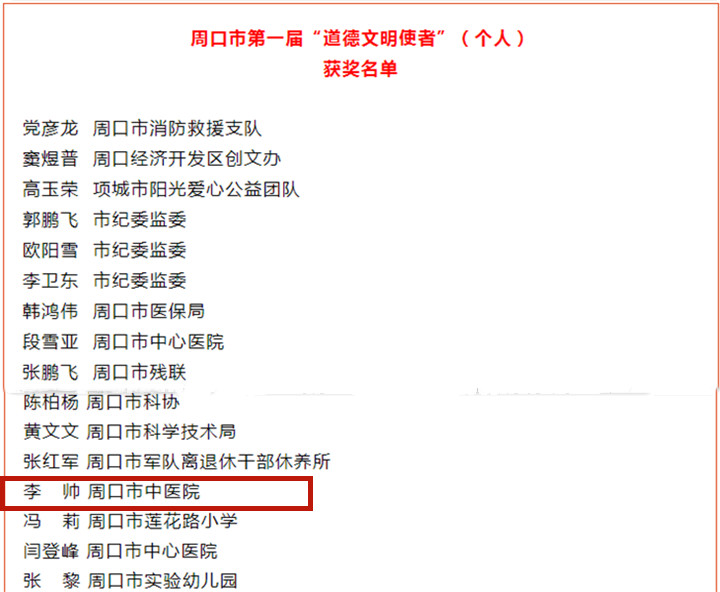 近日,由市委宣傳部、市文明辦、市直機關工委、團市委、市婦聯、市總工會組織開展的第一屆“道德文明使者”評選結果揭曉。按照“道德文明使者”的評選標準,經活動組委會評選審定產生周口市第一屆“道德文明使者”個人150名,組織50個。周口市中醫院中醫志愿服務隊榮獲周口市第一屆“道德文明使者”(組織)稱號,李帥榮獲周口市第一屆“道德文明使者”(個人)稱號。