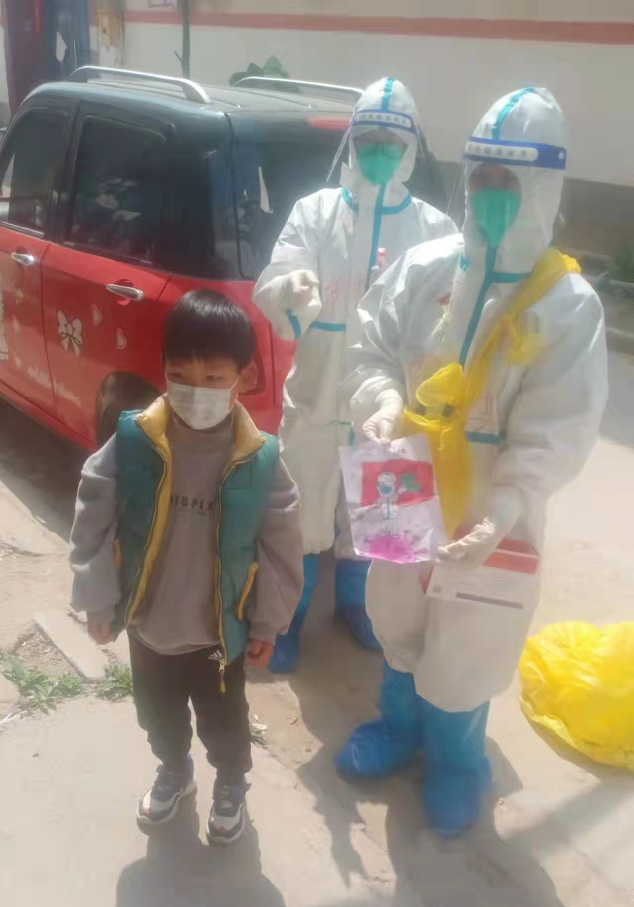 在這次采集核酸工作中,最讓我感動的是一個五歲多的小朋友送給我一幅他自己畫的畫,畫中有一面五星紅旗。五星紅旗前面站著一位身穿防護服的醫務工作者,右手持采集棒,腳下踩著新冠病毒。還配有“你們辛苦啦,必勝的字樣!!!”我相信這幅畫他不是送給我個人的,是送給我們所有參加這次防疫工作人員的,小小少年竟然如此懂事,如此懂得感恩,他用這幅畫表達了對大家的感謝。