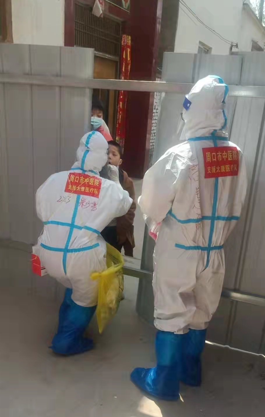 我們17個組共34人被分到朱莊社區。我們的任務是進社區入戶單采核酸。我和高慧霞一組,由一名志愿者帶領,挨家挨戶敲門采集。每天上樓下樓采集幾百人的標本,一天工作結束腿和腳后跟酸疼,但是大家為了防疫早點勝利,沒有一個人有怨言,大家相互關心,相互幫助,相互鼓勵。