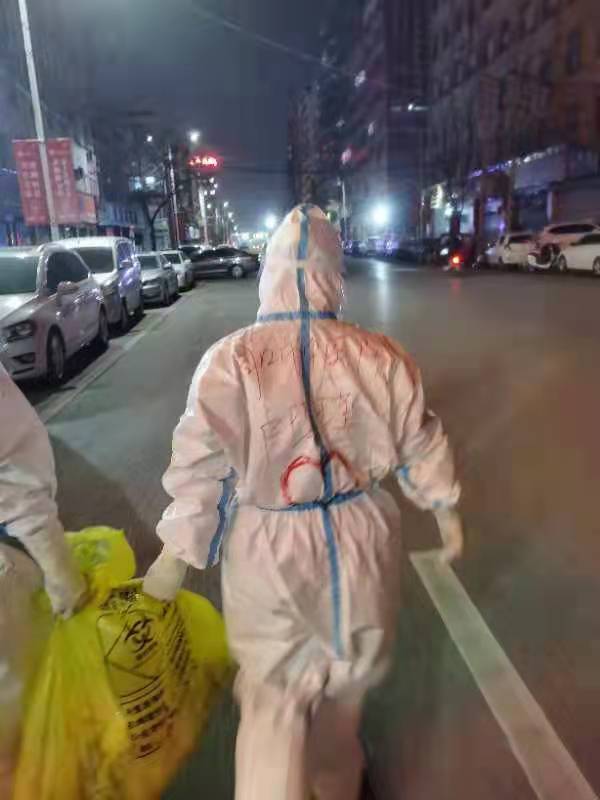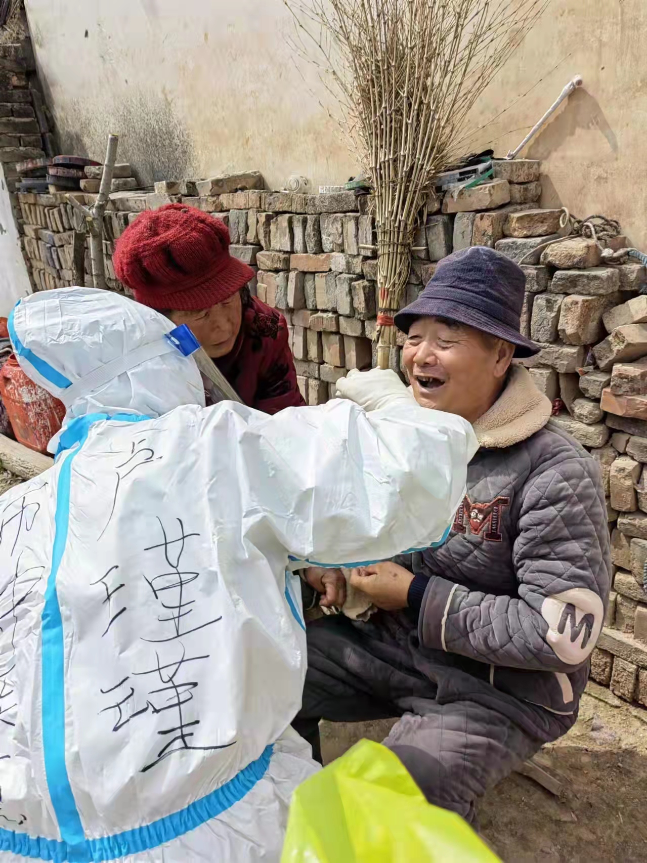 那是我們支援核酸檢測的第一站,太康縣大徐寨鎮四柳樹村,第一次聽到這個村的名字覺得很有生機,村里的道路旁都開滿了黃燦燦的油菜花。村支書熱情又負責,配合我們做好核酸采樣工作,特別是我們對老弱臥床居民入戶采集時,他騎著標配小三輪載著我們走街串巷。村支書對村里每家每戶的情況了如指掌,轉角一戶紅磚房,墻邊坐著一位白發蒼蒼的老爺爺,書記說他年齡大了,聽力很弱,但是看見我們他那滿臉褶皺的臉上掛滿了笑容,顫顫巍巍地豎起他的大拇指,瞬間心里好暖,就如這三月的春風,溫暖人心。所到之處都是“謝謝,你們辛苦了!”“謝謝你們的支援,給了我們希望!”