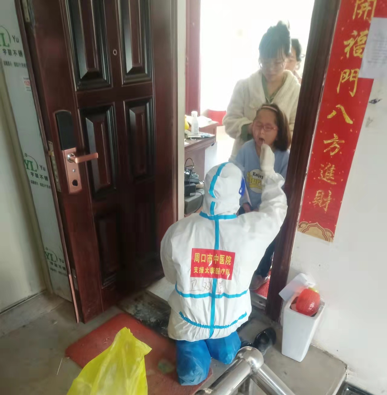 中午12點(diǎn),我們支援太康的團(tuán)隊(duì)到達(dá)五里楊社區(qū),任務(wù)就是為這里的居民進(jìn)行核酸采樣工作,我們已經(jīng)顧不上吃飯,都期盼著快點(diǎn)投入到抗疫的戰(zhàn)斗中去。在劉海泳隊(duì)長(zhǎng)與當(dāng)?shù)仡I(lǐng)導(dǎo)認(rèn)真對(duì)接后,我們團(tuán)隊(duì)立刻開(kāi)始武裝自己,穿上厚重的防護(hù)服,開(kāi)啟戰(zhàn)斗模式。雖然我們是第一次來(lái)到這個(gè)陌生的環(huán)境,但我們同事之間都配合的非常默契。大家都想著與時(shí)間賽跑,為了提高工作效率,我們分成了小組挨家挨戶進(jìn)行采樣。此時(shí),我們的每位同志都穿著防護(hù)服在6~10樓間奔跑,生怕漏掉了一家一戶,不知不覺(jué)間已到凌晨,我們也結(jié)束了今天的工作趕往住宿的地方。一路上,車內(nèi)非常安靜,我看了看身邊的同事都已經(jīng)睡著了。但即使是休息,我們依然不敢松懈,時(shí)刻做好個(gè)人防護(hù)。