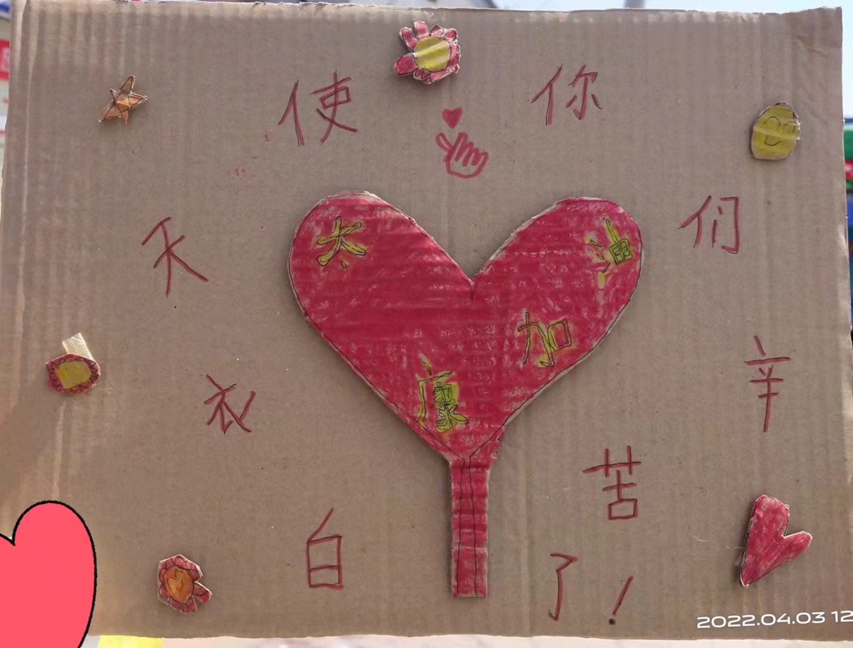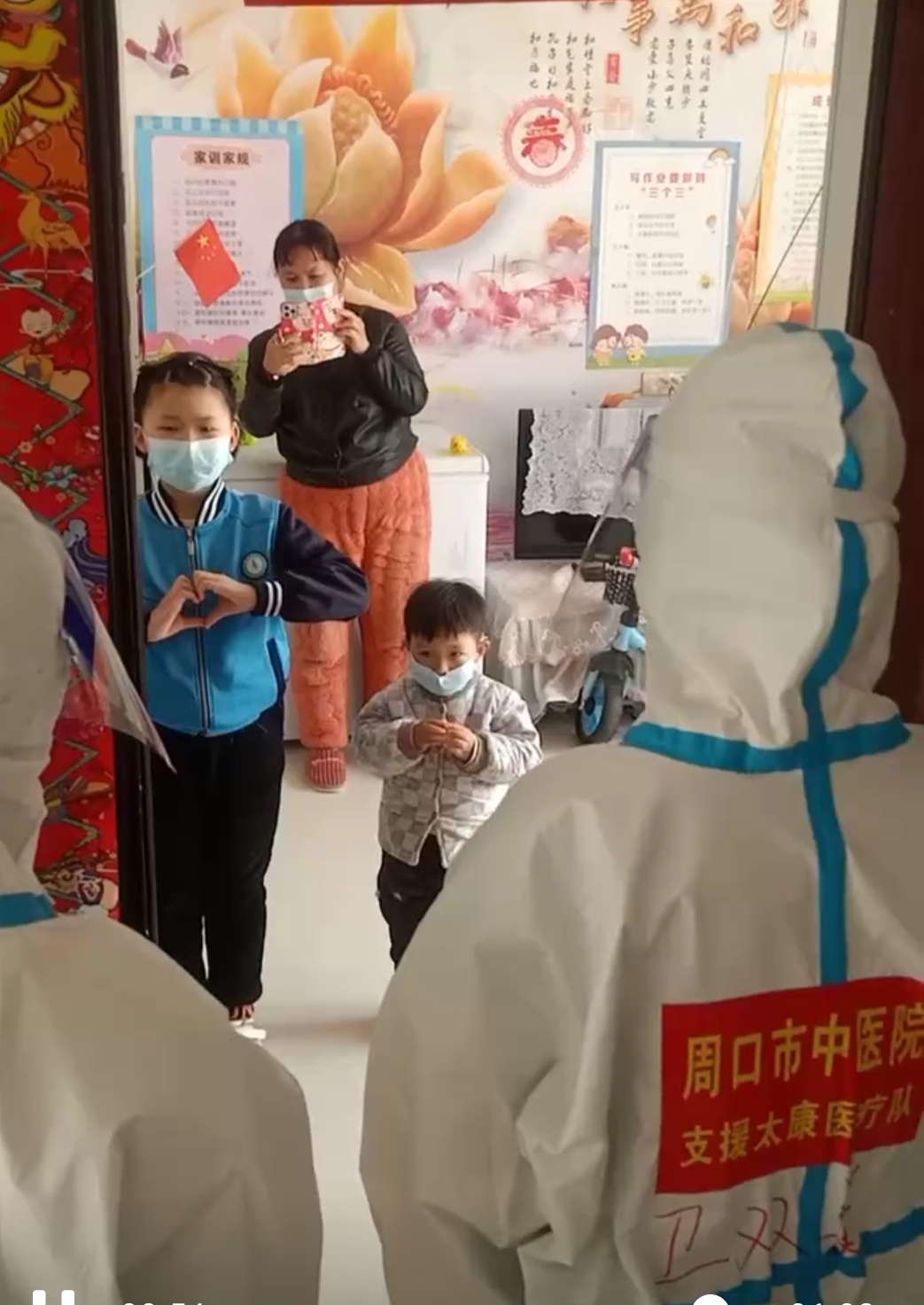 時(shí)間總是過(guò)得很快,今天已經(jīng)是我們支援太康的第五天了。在這五天里,我們感受最多的就是愛(ài)與溫暖。工作中,我們聽(tīng)到了無(wú)數(shù)次“謝謝”,“你們辛苦了”,看到了孩子們表演的手語(yǔ)舞,也收到了寶貝們送給我們的愛(ài)心手工……但是在無(wú)數(shù)的感動(dòng)背后,我們內(nèi)心也有焦慮和不安。4月2日我們剛到采集點(diǎn),就看到120來(lái)到我們社區(qū)接走了兩位陽(yáng)性無(wú)癥狀感染患者,這位患者正是我和隊(duì)友王閃閃每天采樣的小區(qū)居民。為了消除我們的焦慮和不安,結(jié)束一天采集任務(wù)后,讓隊(duì)員稍做休息,劉隊(duì)長(zhǎng)再次組織大家演練穿脫防護(hù)服的流程和咽拭采集方法及醫(yī)療垃圾處理等,確保操作規(guī)范,防護(hù)到位,增強(qiáng)我們的防護(hù)意識(shí),擔(dān)任此次演練示教任務(wù)的我,不知不覺(jué)演練結(jié)束已經(jīng)是將近凌晨一點(diǎn)了,第二天早上六點(diǎn)我們又如常出發(fā)。為保質(zhì)保量完成每天的任務(wù),隊(duì)長(zhǎng)還每天在群中發(fā)防護(hù)操作規(guī)程和各種操作流程視頻。進(jìn)行強(qiáng)化訓(xùn)練讓我們謹(jǐn)記出發(fā)時(shí)程院長(zhǎng)的囑托:“平平安安的走,平平安安的回!”