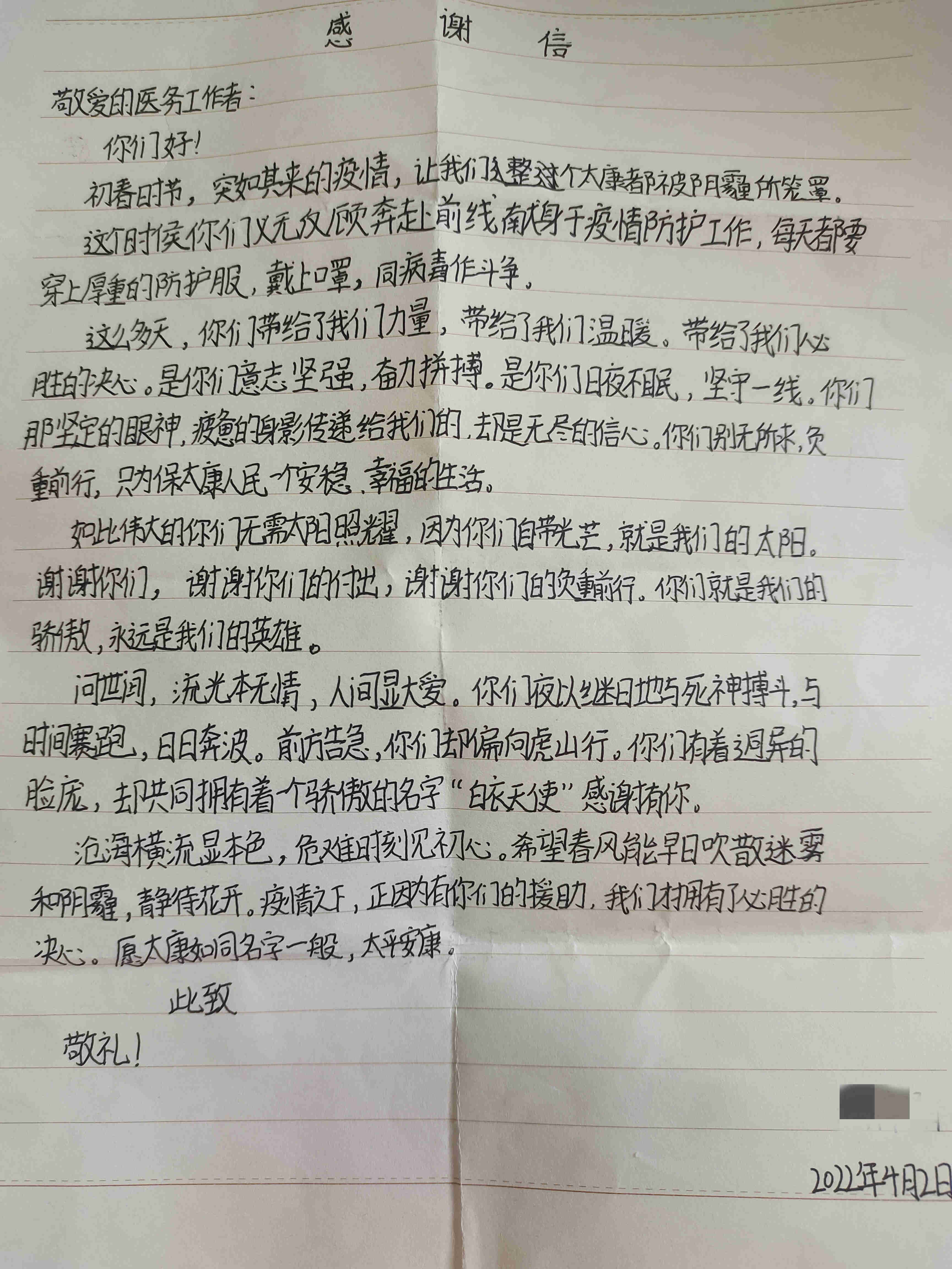 3月31日起,接到上級通知要上門入戶采集,我們又將面臨著一次考驗,工作量很大,不僅是一門一戶,更要面臨的是要一層一層的爬樓,也更考驗了我們的身體素質(zhì)是否過硬。在4月2日那天我們到了13樓,有一個小姑娘看到我們在忙,她站在樓梯旁,并沒說話,等我們忙完,那個小姑娘跑到我跟前說,“阿姨,謝謝你們!你們辛苦了!我想送給你們一封信,你們真的辛苦了!”瞬間被小姑娘的眼神暖到了。她說我們留個紀(jì)念吧!