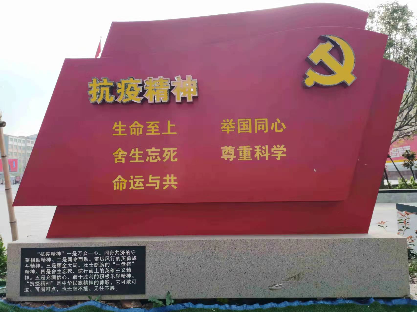 3月31日早,我們臨時接到去縣政府對面廣場再次集結待命的通知。這次來到了封控區——城關回族鎮大梁社區繼續戰斗。進行入戶單采,這次是兩人一組,我們吃飽早飯,準備好物資就出發了。由于樓內樓外、屋內屋外存在冷熱空氣界面,這對戴著眼鏡的我并不友好,鏡片上突然起霧使我視野一片模糊。機智的我不能被這點兒困難絆住,經過反復實踐,發現提前把鏡片沾水可以解決這一問題。經歷了爬樓、敲門、登記、掃碼、封管、封箱等流程后,腿部酸沉感似罐了鉛一樣。入戶采集結束后我感到身心疲倦,就圍繞附近的廣場散步走走。在這里的路邊,佇立著成列的宣傳牌,牌子上記錄著黨和人民在偉大復興中匯聚形成的精神力量,如井岡山精神、雷鋒精神、兩彈一星精神等。我在路的近轉角處猛然發現,有塊牌子上寫著抗疫精神,對其解讀為:生命至上,舉國同心,舍生忘死,尊重科學,命運與共。一瞬間,我倦意全無,第一次感受到我正在做人們所敬仰的人。