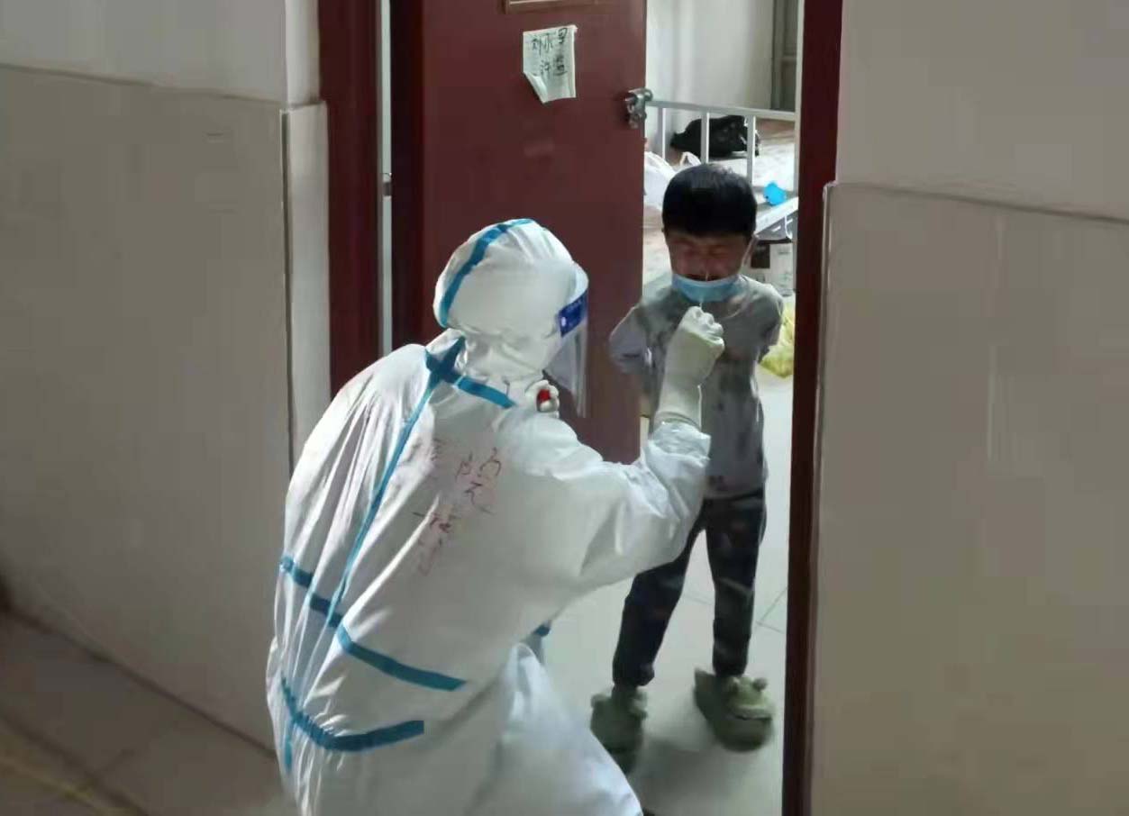 3月30日,我們負(fù)責(zé)隔離樓內(nèi)確診一名新冠陽性患者轉(zhuǎn)運(yùn),指導(dǎo)病人穿上防護(hù)用品,轉(zhuǎn)運(yùn)到救護(hù)車,我們給她做心理疏導(dǎo)。病人最放心不下的是她的女兒,也在隔離,我們隊(duì)員每天都會(huì)去問她女兒情況,需要什么,給孩子和家人信心。