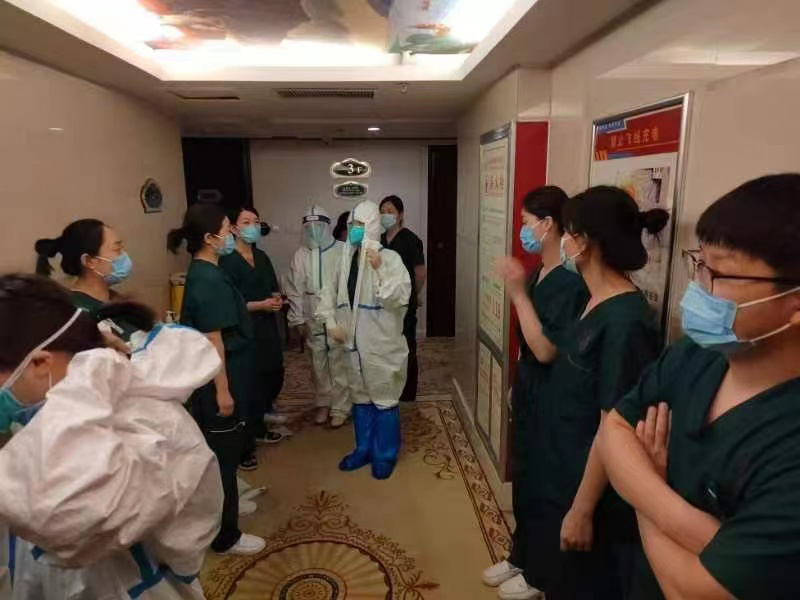來到鄲城第一天,我們來到采集點,準備好物品,就開始了給小區(qū)的居民做核酸采樣。第一天的采樣工作在忙中有序中進行。每天晚上在王濤杰隊長和王婷婷副隊長的帶領下我們集中培訓,一對一訓練,每個人都要掌握穿脫防護服的方法要點及咽拭子采集部位。時間到了晚上22:40,大家仍在精神抖擻的穿脫防護服練習。熟能生巧,我們都是一位合格的鎧甲勇士!
