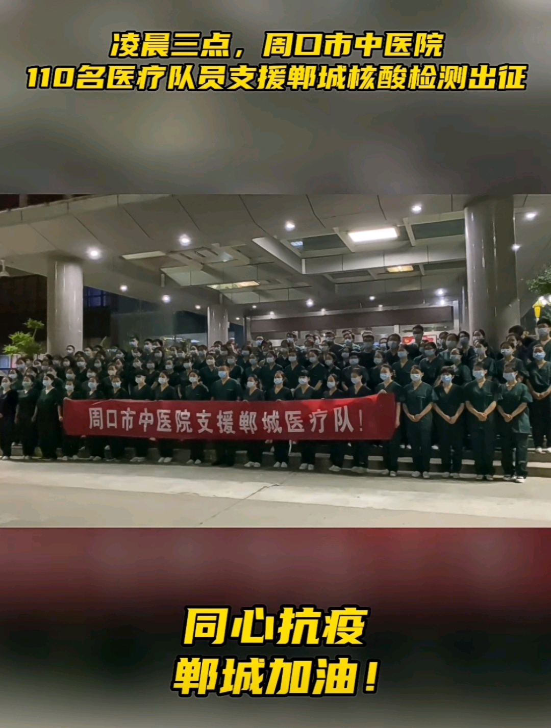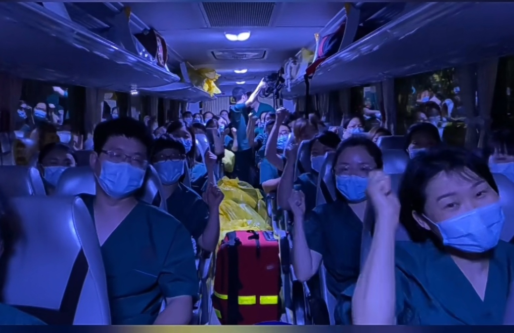 叮鈴鈴……凌晨2點,被鬧鐘叫醒。迅速起來洗漱一下,親吻一下熟睡的兒子,兩點半趕到醫院,等待集合。兄弟姐妹們也陸續提著行李來到醫院,領取必要的防護物資之后,大家在門診樓前集合,舉行了簡短出征儀式,程院長語重心長的說:“大家辛苦了!為了疫情防控,你們舍小家顧大家,克服各種困難奔赴戰疫一線.........大家一定要注意安全防護,盡全力完成市委市政府交給的抗疫任務。”帶著程院長、劉書記的殷殷囑托,醫療隊在隊長王濤杰、副隊長王婷婷的帶領下,分乘兩輛大巴向著目的地——鄲城出發!
