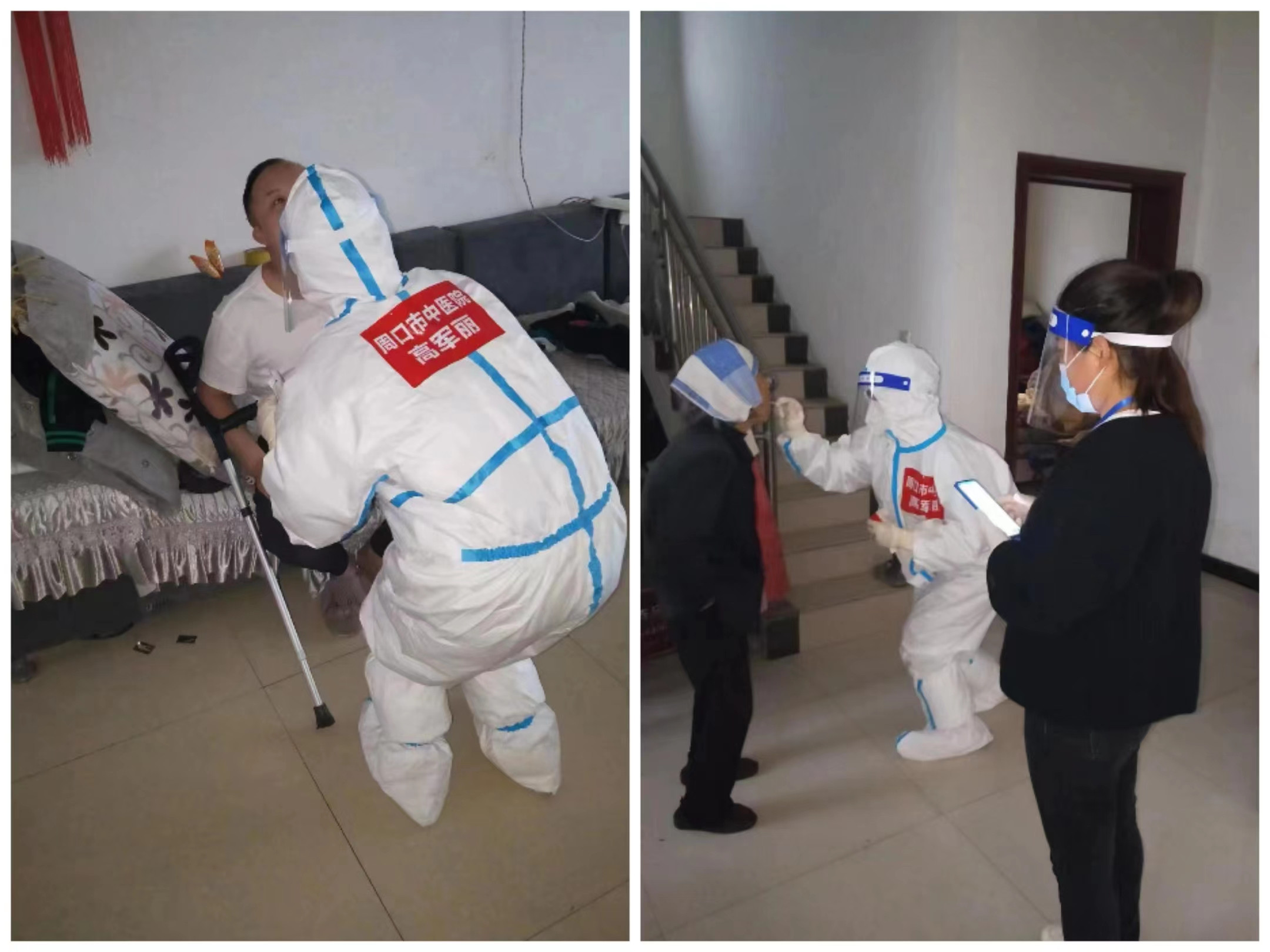 凌晨三點,在程院長、劉書記、史院長等領導們的殷切關懷下,我們夤夜前行。在車上匆匆吃了早餐后,我和呂蘭娟一隊被分派到了白集鎮梁廟村。為了加快工作速度,每組醫務人員獨自一隊在當地村干部和志愿者的配合下一家一戶進行上門核酸采集。雖然有他們進行引導,但整個采樣過程仍需獨立完成。最重要的是采集一定得到位,要不停地指導村民如何充分暴露咽部,右手采集標本,左手拿著試管,然后雙手配合折斷咽拭子頂端,消毒后的雙手摩擦系數減小,再碰到不好折斷的拭子,最后大拇指酸脹難忍都快不受控制了,為了不耽誤大伙最終集合,忍著不適繼續工作。在我和隊友們結束后脫下防護服的那一刻,看見他們滿頭的汗水,戴口罩留下的深深勒痕,不禁相視一笑。