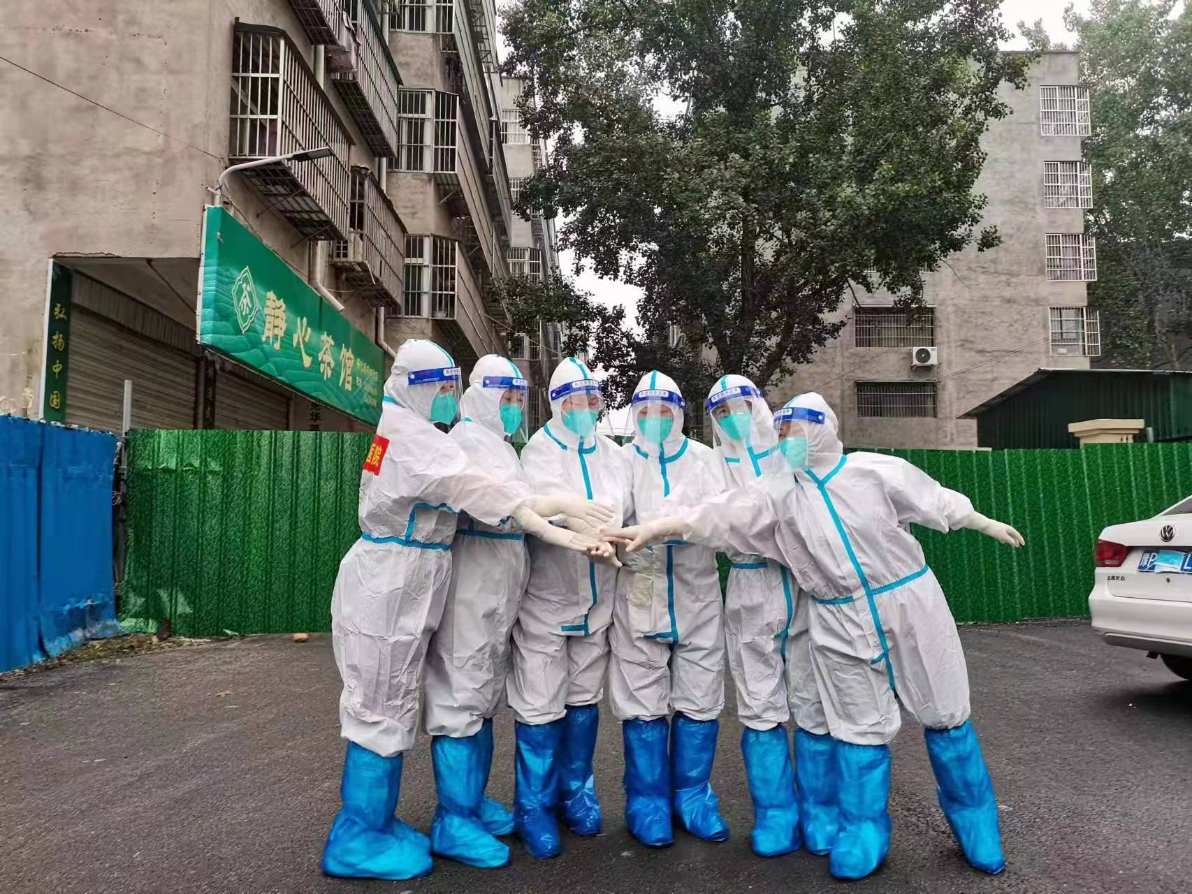 5月6日凌晨3:30,腦二病區成立由劉亞珂、張芳、邊俊英、豆文彗、王思潔、曹肖肖、李妍等人組成的醫療小組加入我院第一批支援鄲城醫療隊,奔赴鄲城開展全縣核酸采樣檢測工作。到達鄲城,再次進行嚴密的醫護人員穿戴防護用品流程培訓以后,進行了分組,立刻對縣內多家單位進行了核酸采集工作。