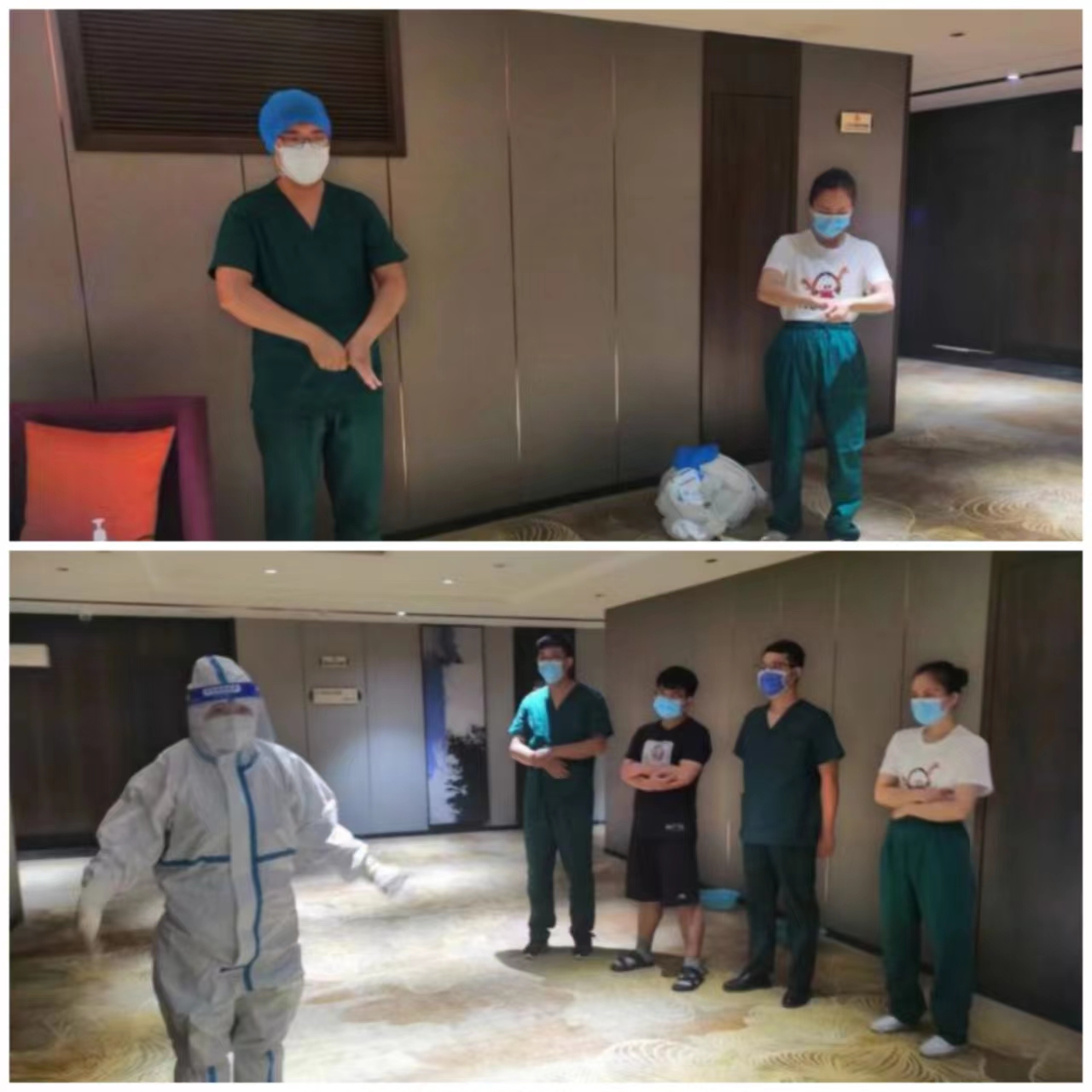 按照三位隊長要求,每天傍晚隊員們都會在酒店大廳練習穿脫防護服。穿脫防護服十分繁瑣,每次練習下來渾身都是大汗淋漓,但大家卻都沒有一絲怨言,互相監督,嚴格按標準完成每一個步驟。因為大家深知我們是一個集體,一舉一動代表著醫院,代表著全體醫務工作者。