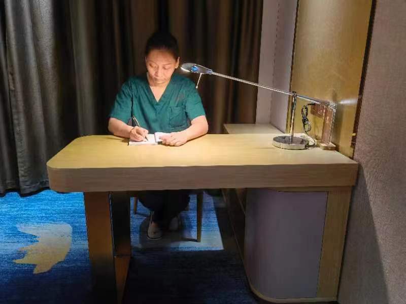 古有大禹治水三過(guò)家門而不入,今天她因參加三次戰(zhàn)疫而有家不能回。疫情就是命令,參加素有殷商之源的商丘支援有一段時(shí)間了,可是參加美麗的銀城太康支援才剛剛回家?guī)滋欤瑡寢屪龅娘埐懦粤藘深D,作為媽媽才給孩子做了兩天的飯。當(dāng)再次接到疫情的命令,她年幼的孩子哭著,喊著:“媽媽,你別去,你剛回家?guī)滋欤蚁肽銒寢尅薄?粗⒆觽兤谂蔚难凵瘢难劬駶?rùn)了,她猶豫了。可是作為門診部的護(hù)士長(zhǎng),作為一名有著帶隊(duì)經(jīng)驗(yàn)的白衣戰(zhàn)士,她的內(nèi)心裝滿了隊(duì)友和需要支援的百姓。她轉(zhuǎn)身離開家門,愛(ài)人把兩個(gè)孩子送回屋里,也悄悄出了大門,一個(gè)溫暖的擁抱,在耳邊輕輕的說(shuō):“你去吧,家里有我呢”。那一刻她的內(nèi)心無(wú)比的感動(dòng)和溫暖。揮手告別后,帶著陪伴她“戰(zhàn)斗”的行李箱踏上了援沈之路。