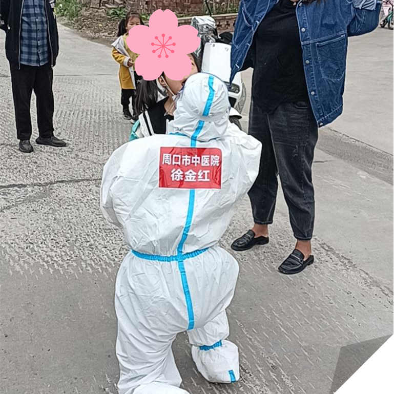 早上5點多我們抵達沈丘,隊長史航進行了工作人員分組任務分工。我選擇了受檢人員較多的沈丘徐樓村。到達地點迅速開始更衣:防護面屏、防護服、防護靴套、口罩、手套、帽子;認真檢查,選擇適合自己的型號。穿好防護服,隊員們互相檢查,調整防護面屏的角度,檢查衣領的角度,確認防護完好后,我們輕輕碰了下手背以示鼓勵。采集工作正式開始,全員核酸采集,采用的是口咽拭子采集標本。汗水濕透了衣衫,面部有了深深的壓痕,口干舌燥。我們互相鼓勵加油。