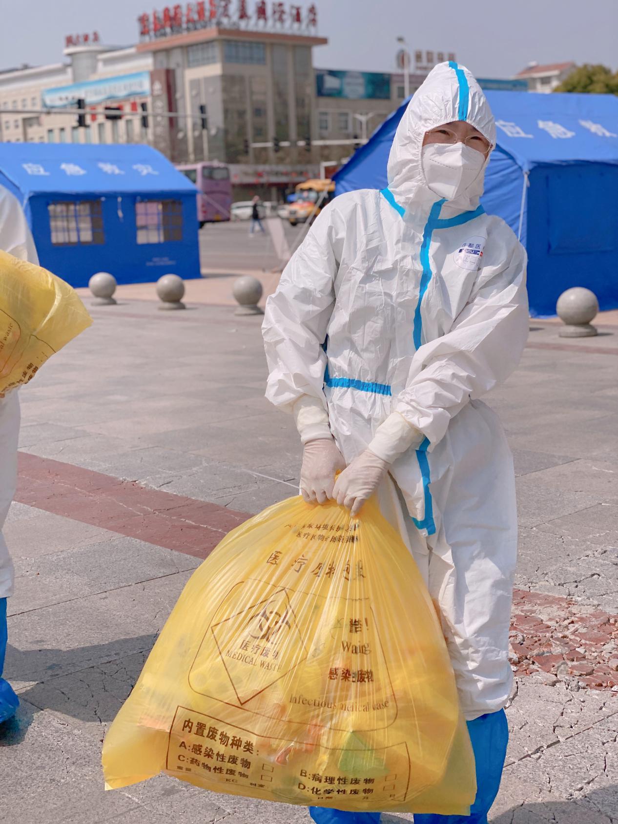 我負責的雖是標本轉運,其危險性不亞于與受檢者直面接觸,我們嚴格按照流程規范操作,穿脫防護服,佩戴口罩、防護面屏、手套和腳套,嚴格把好控感關,保障自己不被感染。