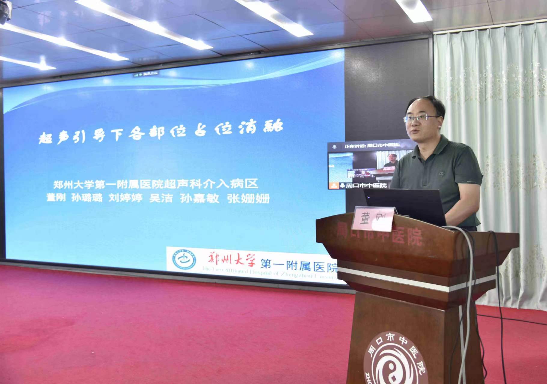 為促進超聲介入醫(yī)療事業(yè)發(fā)展,進一步推廣超聲介入診療技術(shù)在我市中醫(yī)院健康服務(wù)集團的應(yīng)用,7月6日下午,我院邀請鄭州大學(xué)第一附屬醫(yī)院超聲介入科董剛教授來院授課,會議采取線上線下同步進行,主會場設(shè)在周口市中醫(yī)院,各縣市區(qū)牽頭醫(yī)院設(shè)立分會場。周口市中醫(yī)院副院長史衛(wèi)東、我院醫(yī)、技、護理相關(guān)人員以及周口市人民醫(yī)院、西華第一醫(yī)院等多家醫(yī)院相關(guān)人員到現(xiàn)場參會,周口市中醫(yī)院健康服務(wù)集團各縣市區(qū)成員單位線上參會。